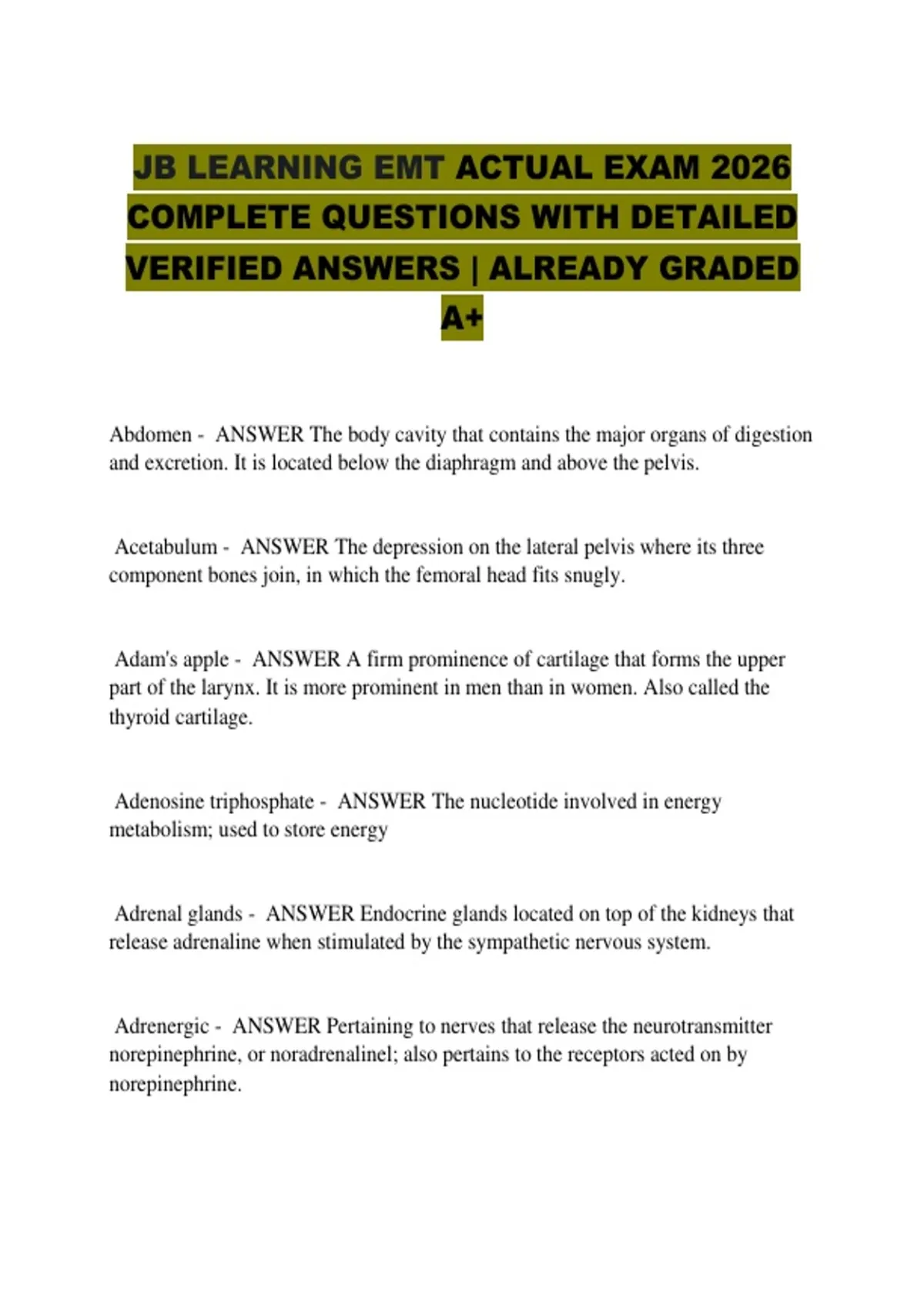 JB LEARNING EMT ACTUAL EXAM 2026 COMPLETE QUESTIONS WITH DETAILED VERIFIED ANSWERS | ALREADY GRADED A+ Abdomen - ANSWER The body cavity that contains the major organs of digestion and excretion. It is located below the diaphragm and above the pelvis. Acetabulum - ANSWER The depression on the lateral pelvis where its three component bones join, in which the femoral head fits snugly. Adam's apple - ANSWER A firm prominence of cartilage that forms the upper part of the larynx. It is more prominent in men than in women. Also called the thyroid cartilage. Adenosine triphosphate - ANSWER The nucleotide involved in energy metabolism; used to store energy Adrenal glands - ANSWER Endocrine glands located on top of the kidneys that release adrenaline when stimulated by the sympathetic nervous system. Adrenergic - ANSWER Pertaining to nerves that release the neurotransmitter norepinephrine, or noradrenalinel; also pertains to the receptors acted on by norepinephrine. Aerobic metabolism - ANSWER Metabolism that can proceed only in the presence of oxygen. Agonal gasps - ANSWER Occasional, gasping breaths that occur after the heart has stopped; seen in dying patients. Alpha - ANSWER A type of energy that is emitted from a strong radiologic source; it is the least harmful penetrating type of radiation and cannot travel more than a few inches or penetrate most objects. Alpha-adrenergic receptors - ANSWER Portions of the nervous system that, when stimulated, can cause constriction of blood vessels Alveloi - ANSWER The air sacs of the lungs in which the exchange of oxygen and carbon dioxide takes place. Anaerobic metabolism - ANSWER The metabolism that takes place in the absence of oxygen; the main byproduct is lactic acid. Anatomic position - ANSWER The position of reference in which the patient stands facing forward, arms at the side, with the palms of the hands forward. Aorta - ANSWER The main artery leaving the left side of the heart, which receives blood from the left ventricle and delivers it to all the other arteries that carry blood to the tissues of the body. Appendicular skeleton - ANSWER The portion of the skeletal system that comprises the arms, legs, pelvis, and shoulder girdle. Appendix - ANSWER A small, tubular structure that is attached to the lower border of the cecum in the lower right quadrant of the abdomen. Arterioles - ANSWER The smallest branches of arteries leading to the vast network of capillaries. Artery - ANSWER A blood vessel, consisting of three layers of tissue and smooth muscle, that carries blood away from the heart. Articular cartilage - ANSWER A pearly white layer of specialized cartilage covering the articular surfaces (contact surfaces on the ends) of bones in synovial joints. Atrium - ANSWER One of two (right and left) upper chambers of the heart. The right receives blood from the vena cava and delivers it to the right ventricle.. The left receives blood from pulmonary veins and delivers it to the left ventricle. Autonomic nervous system - ANSWER The part of the nervous system that regulates involuntary activities of the body, such as heart rate, blood pressure, and digestion of food. Axial skeleton - ANSWER The part of the skeleton comprising the skull, spinal column, and rib cage. Ball-and-socket joint - ANSWER A joint that allows internal and external rotation, as well as bending. Beta - ANSWER A type of energy that is emitted from a strong radiologic source; it is slightly more penetrating than alpha and requires a layer of clothing to stop it. Beta-adrenergic receptors - ANSWER Portions of the nervous system that, when stimulated, can cause an increase in the force of contraction of the heart, an increased heart rate, and bronchial dilation. Biceps - ANSWER The large muscle that covers the front of the humerus. Bile ducts - ANSWER The ducts that convey bile between the liver and the intestine Blood pressure - ANSWER The pressure that the blood exerts against the walls of the arteries as it passes through them. Brachial artery - ANSWER The major vessel in the upper extremities that supplies blood to the arm. Brain - ANSWER The controlling organ of the body and center of consciousness; functions include perception, controls of reactions to the environment, emotional responses, and judgement. Brain stem - ANSWER The area of the brain between the spinal cord and cerebrum, surrounded by the cerebellum; controls functions that are necessary for life, such as respiration. Capillary vessels - ANSWER The tiny blood vessels between the arterioles and venules that permit transfer of oxygen, carbon dioxide, nutrients, and waste between body tissues and the blood. Cardiac muscle - ANSWER The heart muscle.