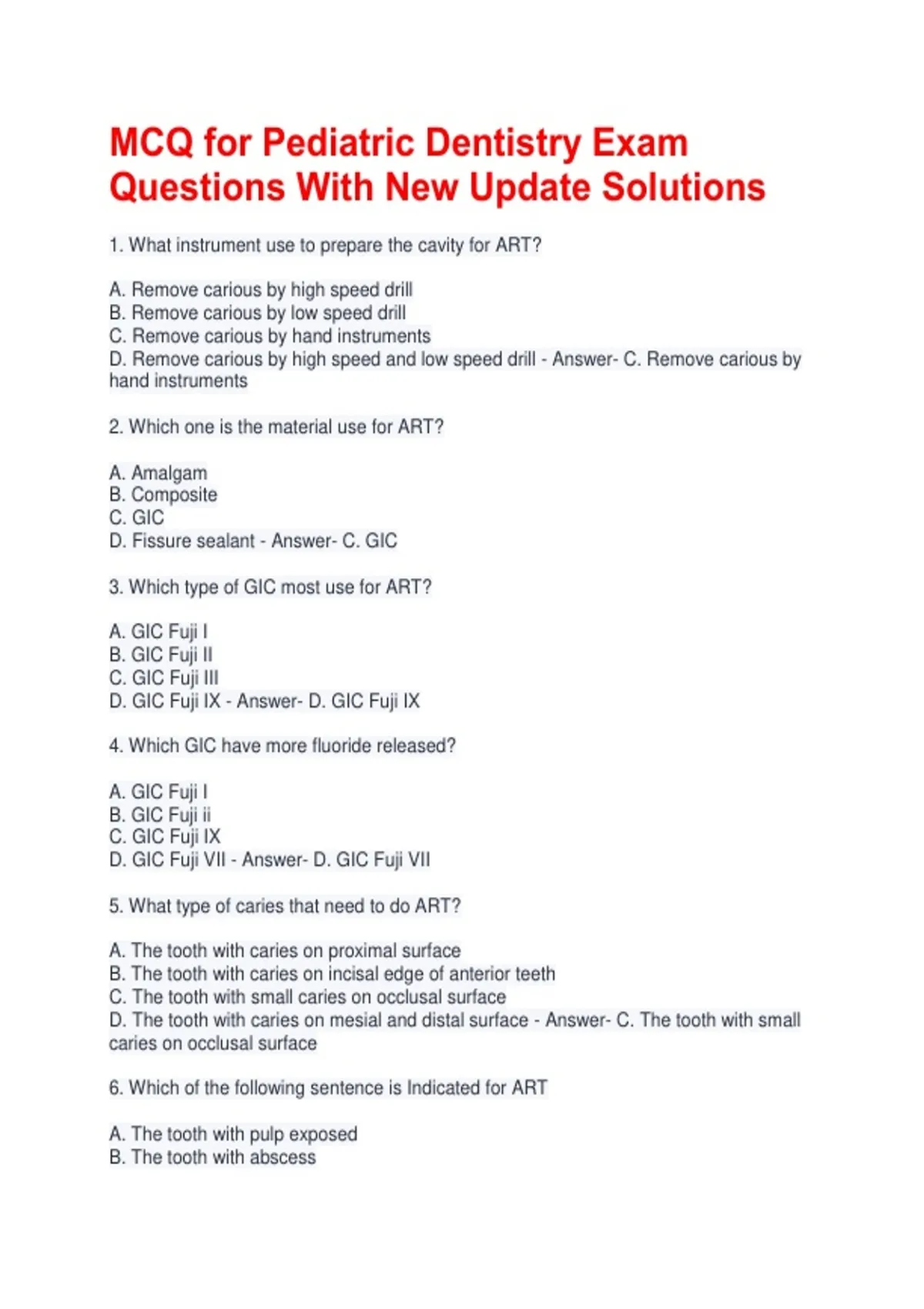 MCQ for Pediatric Dentistry Exam Questions With New Update Solutions 1. What instrument use to prepare the cavity for ART? A. Remove carious by high speed drill B. Remove carious by low speed drill C. Remove carious by hand instruments D. Remove carious by high speed and low speed drill - Answer- C. Remove carious by hand instruments 2. Which one is the material use for ART? A. Amalgam B. Composite C. GIC D. Fissure sealant - Answer- C. GIC 3. Which type of GIC most use for ART? A. GIC Fuji I B. GIC Fuji II C. GIC Fuji III D. GIC Fuji IX - Answer- D. GIC Fuji IX 4. Which GIC have more fluoride released? A. GIC Fuji I B. GIC Fuji ii C. GIC Fuji IX D. GIC Fuji VII - Answer- D. GIC Fuji VII 5. What type of caries that need to do ART? A. The tooth with caries on proximal surface B. The tooth with caries on incisal edge of anterior teeth C. The tooth with small caries on occlusal surface D. The tooth with caries on mesial and distal surface - Answer- C. The tooth with small caries on occlusal surface 6. Which of the following sentence is Indicated for ART A. The tooth with pulp exposed B. The tooth with abscess C. The tooth with caries at EDJ D. The tooth with periodontitis - Answer- C. The tooth with caries at EDJ 7. Which the cavity is suitable for ART? A. Big cavity B. Small cavity C. Cavity broken wall D. Pulp exposed cavity - Answer- B. Small cavity 8. Which of the following teeth are early to be caries? A. Incisors teeth B. Premolars teeth C. First molar teeth D. Second molar - Answer- C. First molar teeth 9. Which of the following sentence is the advantage of GIC? A. Esthetic B. Fluoride released C. Strong D. Durable - Answer- B. Fluoride released 10. Which one of the following instrument is mostly use to remove dental caries? A. Mirror B. Tweezer C. Probe D. Spoon excavator - Answer- D. Spoon excavator 11. At ages 6 month which tooth start to erupt? A. tooth number 55 and 65 B. tooth number 74 and 84 C. tooth number 71 and 81 D. tooth number 51 and 61 - Answer- C. tooth number 71 and 81 12. At ages 9month which tooth start to erupt? A. tooth number 54 and 64 B. tooth number 75 and 85 C. tooth number 73 and 83 D. tooth number 52 and 62 - Answer- D. tooth number 52 and 62 13. At ages 18 month which tooth start to erupt? A. tooth number 75 and 85 B. tooth number 73 and 83 C. tooth number 71 and 81 D. tooth number 52 and 62 - Answer- B. tooth number 73 and 83 14. What time of ages the first permanent molars erupt? A. at 5 years old B. at 6 years old C. at 7 years old D. at 8 years old - Answer- B. at 6 years old 15. What time of ages that the permanent upper central incisor erupt? A. at 7 years old B. at 8 years old C. at 9 years old D. at 10 years old - Answer- A. at 7 years old 16. What time of ages that the permanent lower central incisor erupt? A. at 5 years old B. at 6 years old C. at 7 years old D. at 8 years old - Answer- B. at 6 years old 17. What time of ages that the permanent second molars erupt? A. at 9 years old B. at 10 years old C. at 11 years old D. at 12 years old - Answer- D. at 12 years old 18. Where the maxillary canine is often impacted? A. it's often impacted palatally B. it's often impacted labially C. it's often impacted palatally and labially D. it's often impacted mesially and distally - Answer- C. it's often impacted palatally and labially 19. What are the teeth mostly missing? A. lateral incisor, premolar, third molar B. lateral incisor, canine, first molar C. central incisor, canine , second molar D. first premolar, canine , third molar - Answer- A. lateral incisor, premolar, third molar 20. What is the arch length? A. is the length of a perpendicular line from the contact point of the upper central to a line joining the distal contact point of second primary molars or second permanent premolars B. is the length from the contact point of the upper centrals to a line joining the distal contact point of first primary molars C. is the length from the contact point of upper centrals to a line joining the distal contact point of first permanent molars D. is the length from the contact point of upper centrals to a line joining the distal contact point of third permanent molars - Answer- A. is the length of a perpendicular line from the contact point of the upper central to a line joining the distal contact point of second primary molars or second permanent premolars