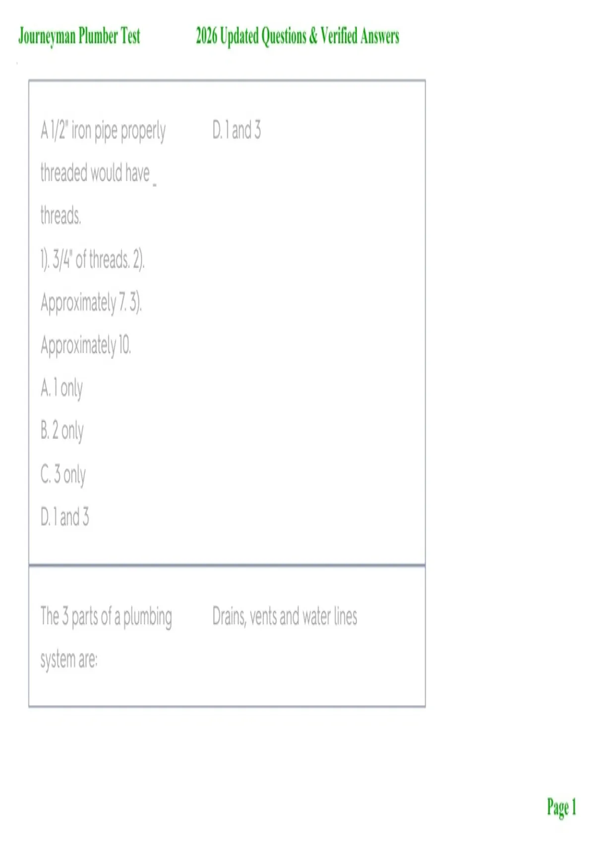 Converted Journeyman Plumber Test material. Includes questions and answers to help aspiring plumbers review key plumbing concepts, reinforce technical skills, and prepare effectively for journeyman licensing exams.