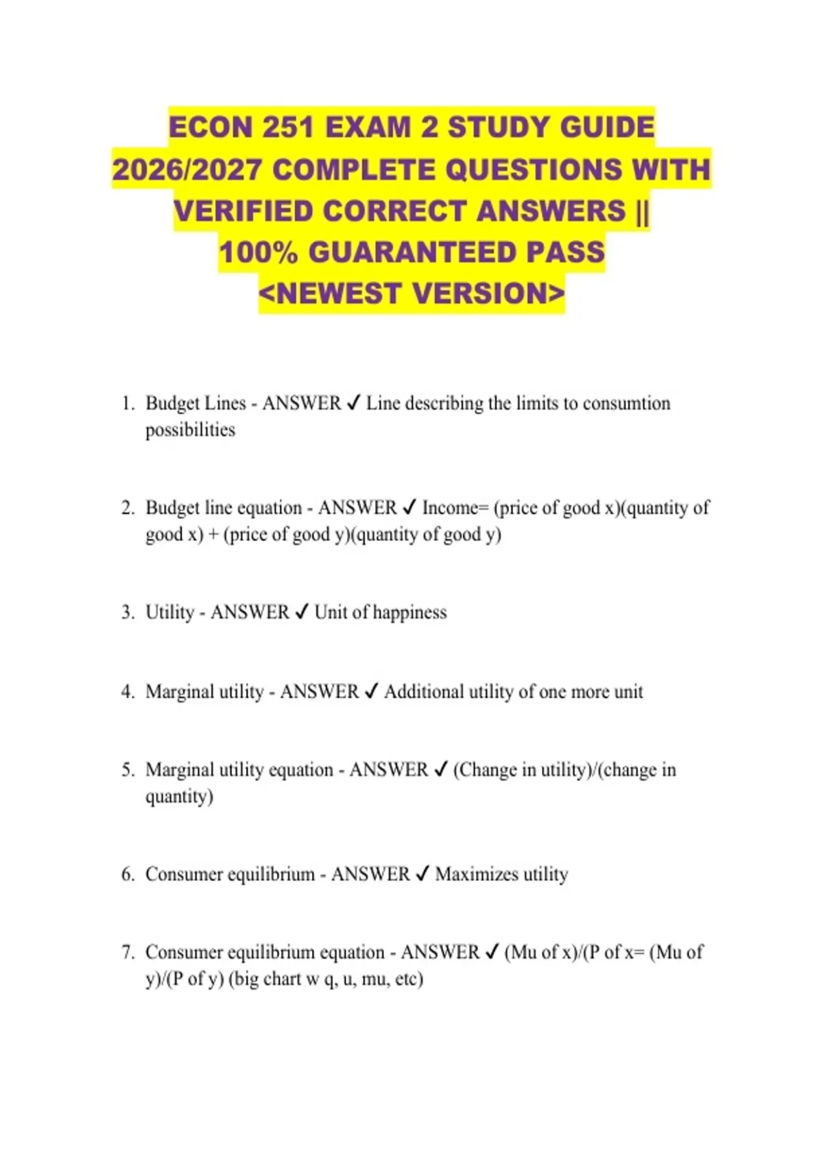 ECON 251 EXAM 2 STUDY GUIDE 2026/2027 COMPLETE QUESTIONS WITH VERIFIED CORRECT ANSWERS || 100% GUARANTEED PASS &lt;NEWEST VERSION&gt; 1. Budget Lines - ANSWER Line describing the limits to consumtion possibilities 2. Budget line equation - ANSWER Income= (price of good x)(quantity of good x) + (price of good y)(quantity of good y) 3. Utility - ANSWER Unit of happiness 4. Marginal utility - ANSWER Additional utility of one more unit 5. Marginal utility equation - ANSWER (Change in utility)/(change in quantity) 6. Consumer equilibrium - ANSWER Maximizes utility 7. Consumer equilibrium equation - ANSWER (Mu of x)/(P of x= (Mu of y)/(P of y) (big chart w q, u, mu, etc) 8. Which is more valuable of water or diamonds? - ANSWER Total utility of water is greater than total utility of diamonds BUT marginal utility of water is greater than marginal utility of diamonds 9. Indifference curve - ANSWER Curve of a combination of goods amount which a consumer is indifferent (tangent to budget line) 10. Marginal Rate of Substitution - ANSWER Rate at which a consumer is willing to give up good x for an additional unity of y (|slope|) 11. Marginal Rate of Substitution equation - ANSWER Relative price of a good at the best alt point 12. Substitution effect - ANSWER Focuses on the change in slope from changes in relative prices 13. P&lt;ATC - ANSWER The firm incurs an economic loss 14. P=ATC - ANSWER The firm makes a normal profit and zero economic profit 15. P&gt;ATC - ANSWER The firm makes an economic profic 16. Short-run Market Supply Curve - ANSWER Shows the quantity supplied by all the firms in the market at each price when each firm's plant and number of firms remain the same 17. Shutdown Point - ANSWER The price and quantity at which the firm is indifferent between producing and shutting down. P=minimum AVC 18. P&lt;AVC - ANSWER The firm should shutdown 19. P&gt;AVC - ANSWER The firm should continue production 20. Marginal Revenue (MR) - ANSWER MR=(deltaTR)/(deltaquantity) 21. Total Revenue (TR) - ANSWER TR=PxQ 22. Minimum Efficient Scale - ANSWER The smallest output at which the long-run average cost reaches its lowest level 23. what happens when heteroskedasticity present - ANSWER bias in var(β(hat)j) formula, SEs no longer valid: need robust SEs 24. measurement error - ANSWER observed values are diff from true values, variables that data gets collected on differ from variables that influence decisions 25. measurement error in dependent (y) variable - ANSWER if error has 0 variance and isn't correlated w x variables, zero conditional mean holds and coefficients are unbiased/consistent 26. presents of measurement error in y variable causes - ANSWER increase in variance of residuals and OLS estimates 27. measurement error in explanatory (x) variable - ANSWER if satisfies error-in-vars, regression coefficient attenuated towards 0 and OLS estimator inconsistent ; if doesn't meet error-in-vars, coefficient biased in unknown direction 28. An implication of the return-to-entrepreneurship curve is that ________. 46) A) all entrepreneurs in an economy with extractive institutions have exactly the same return B) all entrepreneurs in an economy with inclusive institutions have exactly the same return C) for a relatively lower return, there will be fewer entrepreneurs with at least that return D) for a relatively lower return, there will be more entrepreneurs with at least that return - ANSWER D. for a relatively lower return, there will be more entrepreneurs with at least that return 29. The ________ hypothesis claims that differences in natural environment, such as climate and ecology, are ultimately responsible for the major differences in prosperity observed around the world. 47) A) location B) climate C) ecology D) geography - ANSWER D. geography 30. Which of the following statements is true of Europeans during the period of colonization? 48) A) Europeans set up extractive economic institutions in all areas. B) Europeans set up inclusive economic institutions in all areas. C) Europeans set up relatively extractive economic institutions in areas that had higher population densities. D) Europeans set up relatively inclusive economic institutions in areas that had higher population densities. - ANSWER C. Europeans set up relatively extractive economic institutions in areas that had higher population densities.