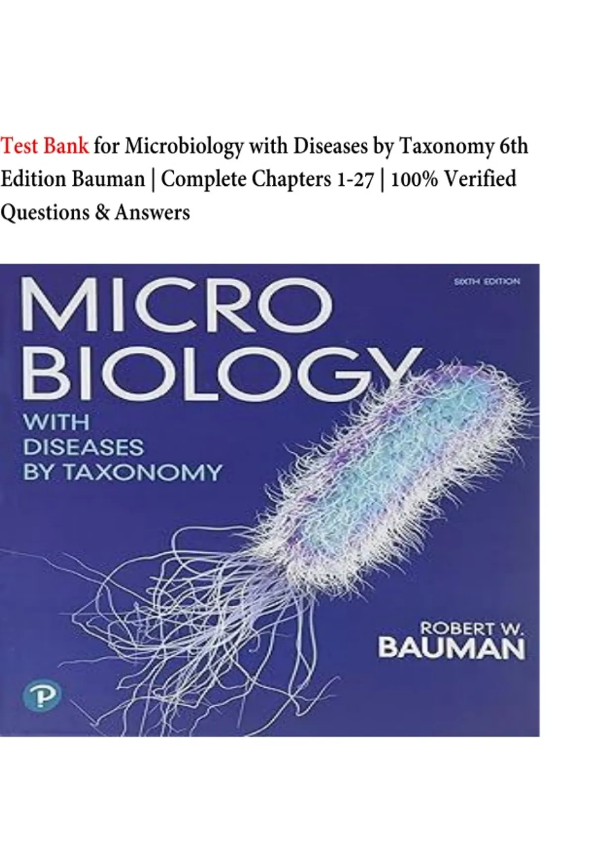 Complete Test Bank for Microbiology with Diseases by Taxonomy 6th Edition by Robert Bauman. Covers all chapters (1-27) with 100% verified questions and answers. Ideal for microbiology, nursing, and biology students for exam preparation, quizzes, and course review. This reliable resource aligns perfectly with the Bauman textbook for guaranteed academic success.