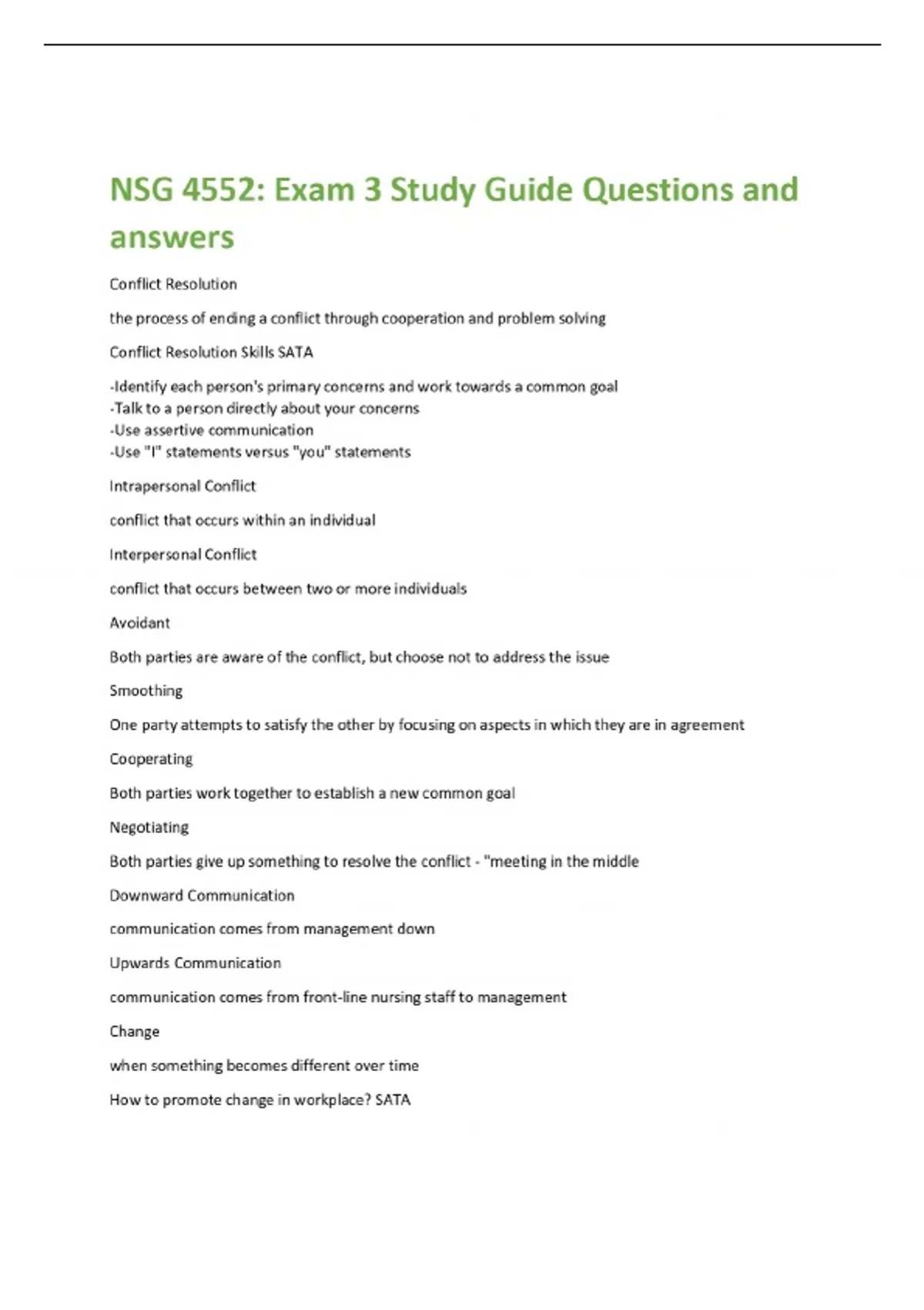 NSG 4552: Exam 3 Study Guide Questions and answers Conflict Resolution the process of ending a conflict through cooperation and problem solving Conflict Resolution Skills SATA -Identify each person's primary concerns and work towards a common goal -Talk to a person directly about your concerns -Use assertive communication -Use "I" statements versus "you" statements Intrapersonal Conflict conflict that occurs within an individual Interpersonal Conflict conflict that occurs between two or more individuals Avoidant Both parties are aware of the conflict, but choose not to address the issue