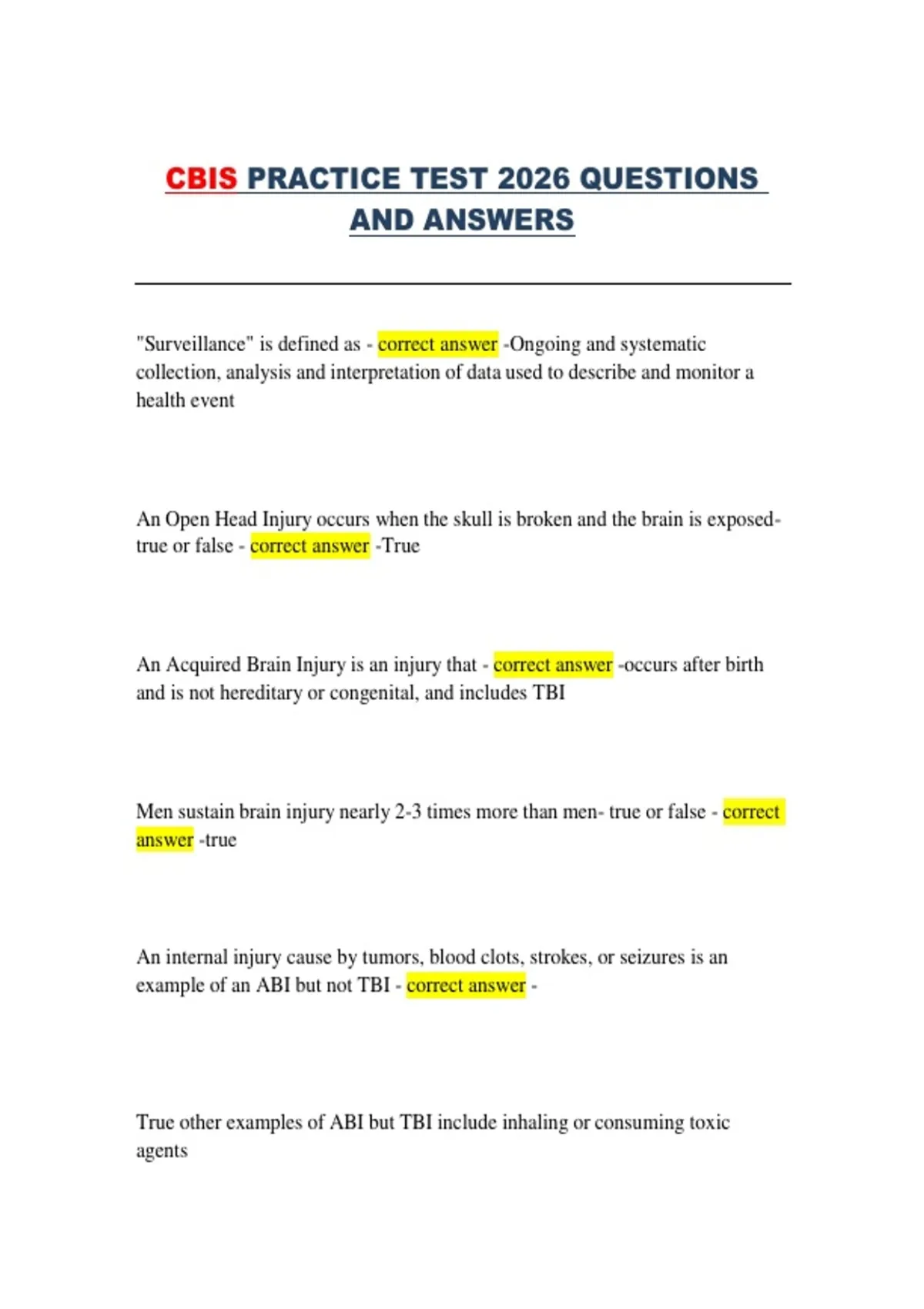 This document contains an extensive set of CBIS practice test questions with correct answers covering core brain injury concepts, anatomy, rehabilitation models, legislation, assessment tools, and medical terminology. It is designed to support preparation for the Certified Brain Injury Specialist (CBIS) exam by reinforcing key knowledge areas and commonly tested material. The content is suitable as a comprehensive review tool for students and professionals preparing for the 2026 CBIS examination.