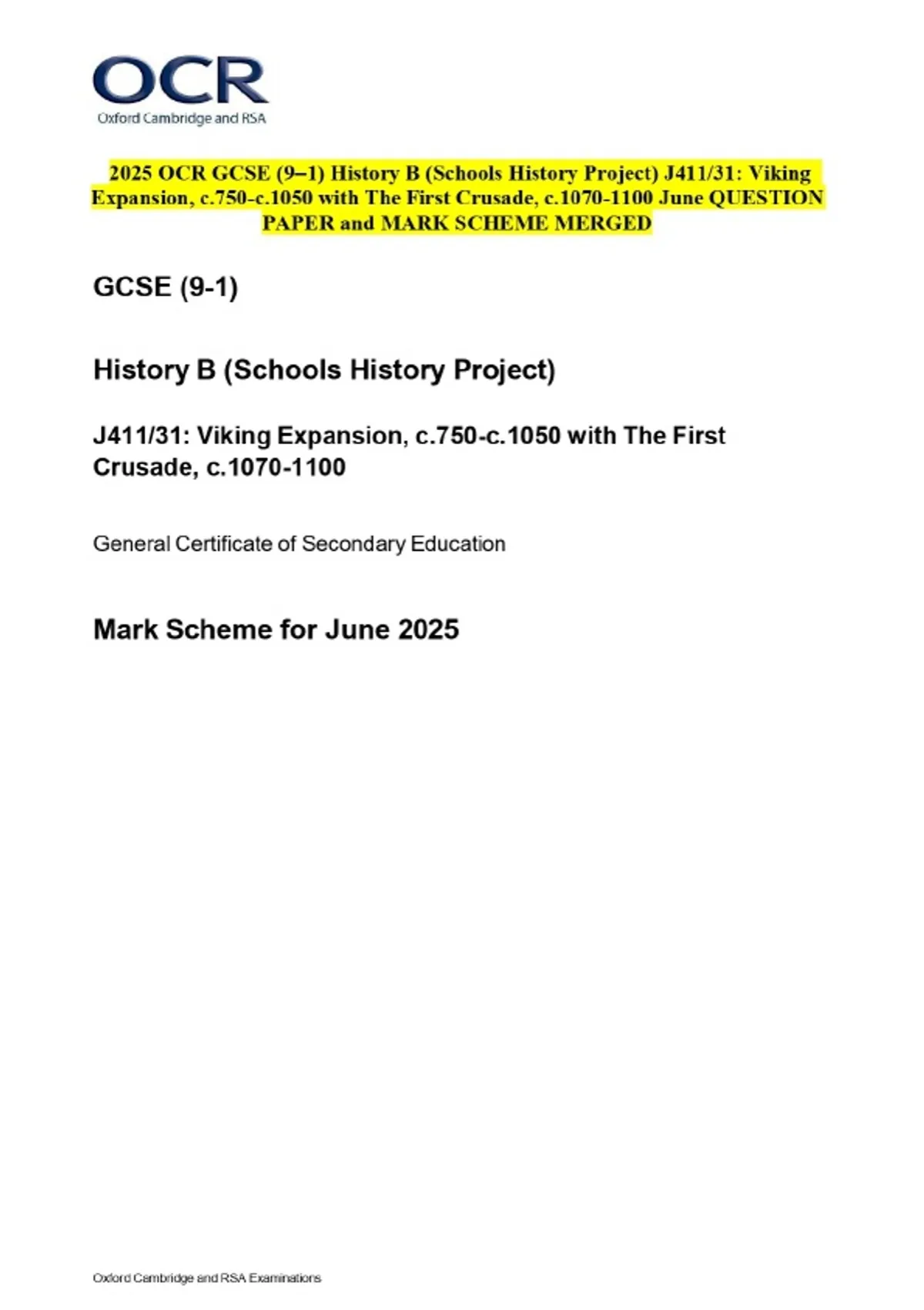 2025 OCR GCSE (9–1) History B (Schools History Project) J411/31: Viking Expansion, c.750-c.1050 with The First Crusade, c. June QUESTION PAPER and MARK SCHEME MERGED