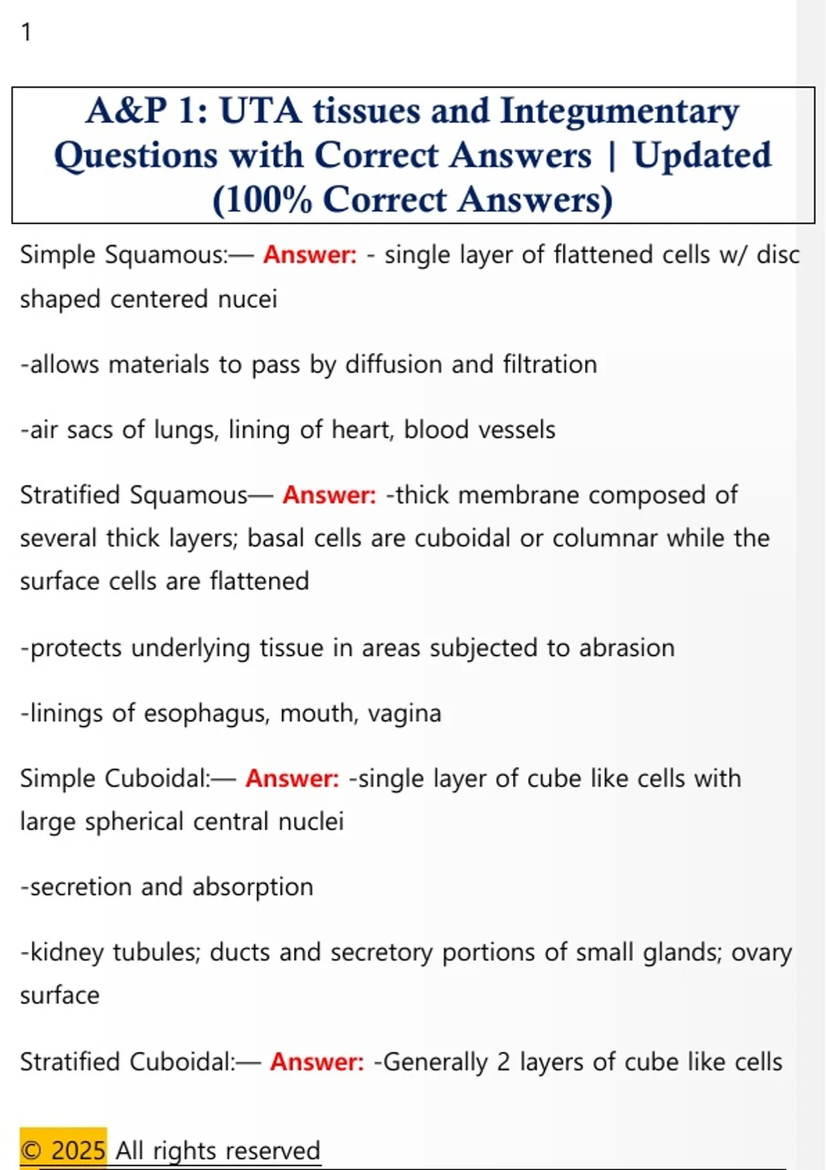 A&P 1: UTA tissues and Integumentary Questions with Correct Answers | Updated (100% Correct Answers)