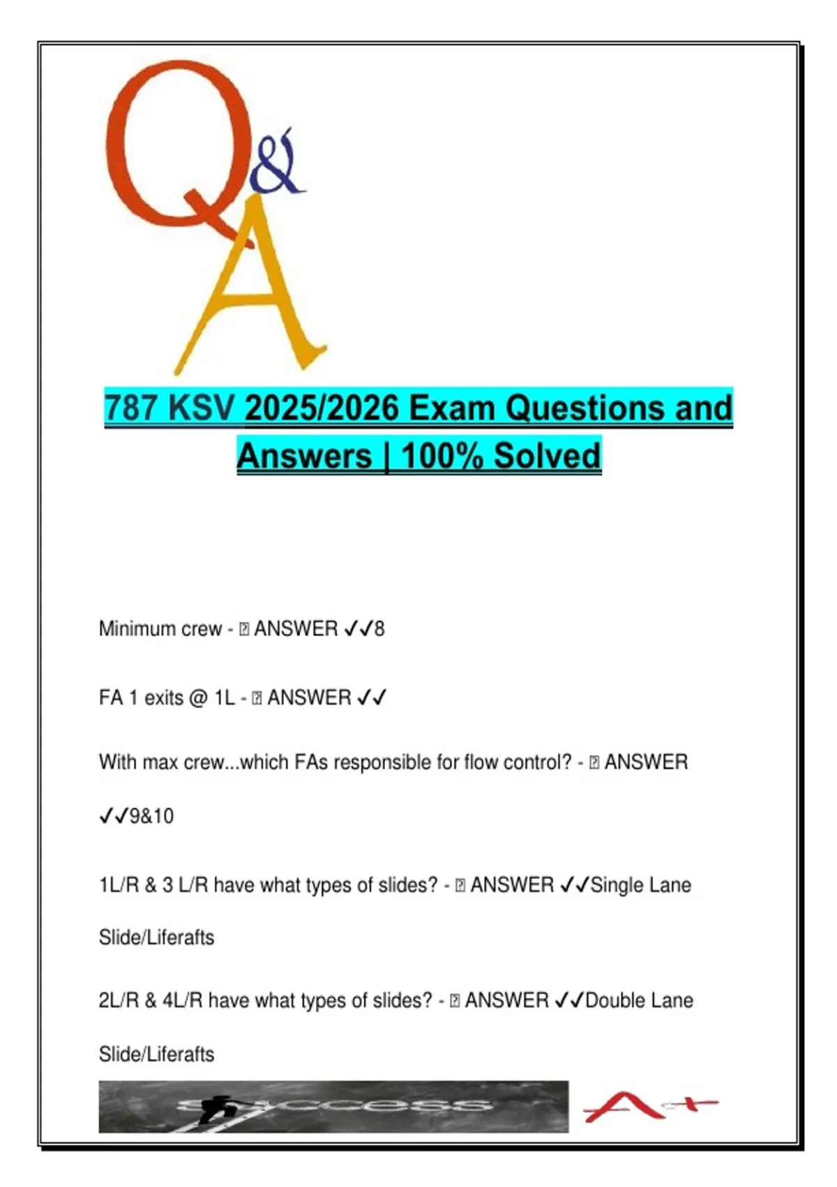 This document contains verified exam questions and correct answers for the Boeing 787 KSV (Knowledge, Skills, and Verification) program, updated for the 2025/2026 training cycle. It includes essential crew procedures, decompression protocols, slide/liferaft configurations, emergency equipment locations, oxygen mask deployment, and cabin zones. It is especially useful for flight attendants preparing for operational exams or recurrent training, and addresses both the 787-8 and 787-9 aircraft models. Keywords: minimum crew emergency slides EDW windows decompression procedures oxygen mask duration lavatory equipment raft load capacities survival kit OFAR and OFCR slide inflation handle flight attendant duties emergency light system exit seat configuration business class layout infant amenities premium bar location