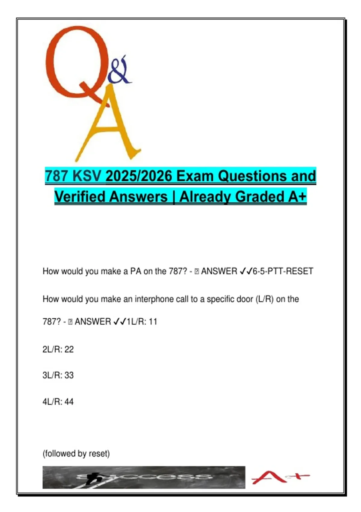 This document contains verified and graded A+ exam questions with answers for the Boeing 787 KSV (Knowledge, Skills, and Verification) training program for 2025/2026. It covers interphone codes, PA procedures, oxygen and decompression systems, lavatory safety, cabin layout, slide/liferaft types, seat labeling, evacuation protocols, and location of critical equipment. Includes detailed information for 787-8, 787-8T, and 787-9 models, ideal for crew members preparing for assessments or flight safety checks. Keywords: interphone codes PA procedures oxygen flow indicator OFAR and OFCR CAP locations emergency lighting door status indicators seat labeling evacuation protocols FA duties medical equipment lavatory locations bassinet weight limit crew jumpseats flight deck egress slide/liferafts ELT retrieval firefighter role