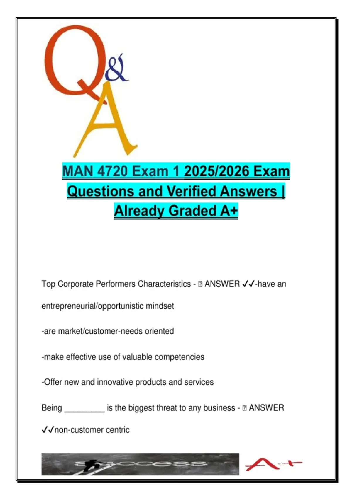 This document includes 60 fully verified questions and correct answers from Exam 1 of the MAN4720 Strategic Management course for the 2025/2026 academic year. It covers foundational and advanced strategy topics including: Top corporate performer characteristics Strategic competitiveness and core competencies I/O (Industrial Organization) model and resource-based model assumptions Porter's Five Forces of competition Stakeholder theory (capital market, product market, and organizational stakeholders) External and internal environment analysis Competitive advantage and sustainability Disruptive technologies, strategic flexibility, and hypercompetition Cost leadership and differentiation strategies Value chain and capability development The questions are framed to test real-world business application, strategic thinking, and analytical skills aligned with industry-relevant models. The content is already graded A+ and presented in a clear Q&A format to support deep comprehension and retention. This resource is especially useful for: Undergraduate and graduate students in business administration, entrepreneurship, management, or MBA programs Learners enrolled in strategic management, business policy, or organizational strategy courses Professionals and exam-preppers seeking a strategic framework to understand firm performance, industry competition, and innovation-driven growth Use this document for self-assessment, exam review, or as a structured refresher on corporate strategy fundamentals. Keywords: MAN4720, strategic management, competitive advantage, core competencies, I/O model, stakeholder theory, Porter's five forces, external environment, internal analysis, cost leadership, differentiation, strategic flexibility, disruptive innovation, resource-based view, strategic competitiveness, value chain, entrepreneurship, risk management, market positioning, business strategy