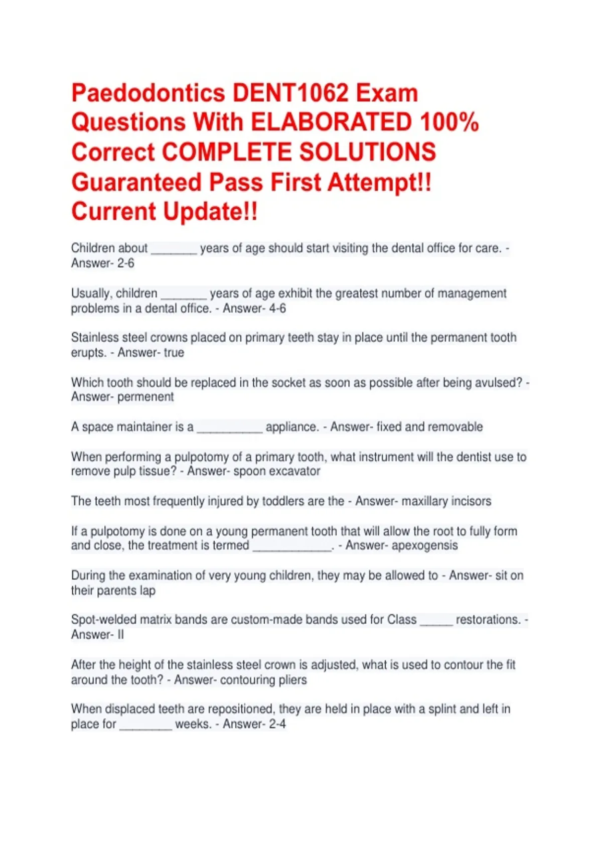 Paedodontics DENT1062 Exam Questions With ELABORATED 100% Correct COMPLETE SOLUTIONS Guaranteed Pass First Attempt!! Current Update!! Children about _______ years of age should start visiting the dental office for care. - Answer- 2-6 Usually, children _______ years of age exhibit the greatest number of management problems in a dental office. - Answer- 4-6 Stainless steel crowns placed on primary teeth stay in place until the permanent tooth erupts. - Answer- true Which tooth should be replaced in the socket as soon as possible after being avulsed? - Answer- permenent A space maintainer is a __________ appliance. - Answer- fixed and removable When performing a pulpotomy of a primary tooth, what instrument will the dentist use to remove pulp tissue? - Answer- spoon excavator The teeth most frequently injured by toddlers are the - Answer- maxillary incisors If a pulpotomy is done on a young permanent tooth that will allow the root to fully form and close, the treatment is termed ____________. - Answer- apexogensis During the examination of very young children, they may be allowed to - Answer- sit on their parents lap Spot-welded matrix bands are custom-made bands used for Class _____ restorations. - Answer- II After the height of the stainless steel crown is adjusted, what is used to contour the fit around the tooth? - Answer- contouring pliers When displaced teeth are repositioned, they are held in place with a splint and left in place for ________ weeks. - Answer- 2-4 In the restoration of an indirect pulp cap, ____________ is placed first. - Answer- calcium hydroxide The avulsed tooth is ____________. - Answer- rinsed clean of debris Formocresol is a(n) ____________. - Answer- bactericidal Which information for diagnosis and treatment planning for a pediatric patient would not be necessary? - Answer- pocket probing Usually a dentist will not begin some form of treatment for thumb sucking until age _____. - Answer- 5 At ________ years, a child should first be able to respond to the dentist's instructions. - Answer- 2-6 How will a dentist restore a severely decayed and endodontically treated primary tooth? - Answer- stainless steel crown Traumatic _____ occurs when the injured tooth has been forced inward. - Answer- intrusion Which type of matrix is used to restore primary teeth where a proximal surface is missing? - Answer- tband