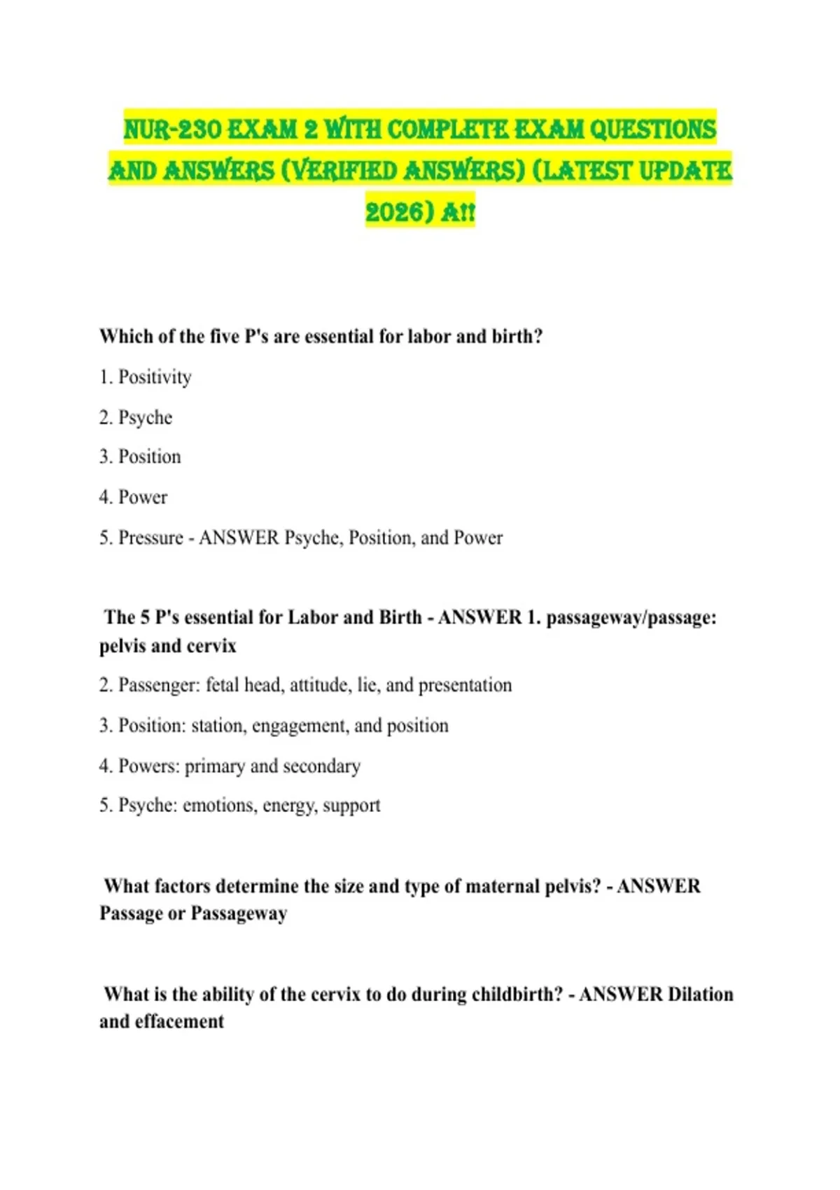 The 5 P's essential for Labor and Birth - ANSWER 1. passageway/passage: