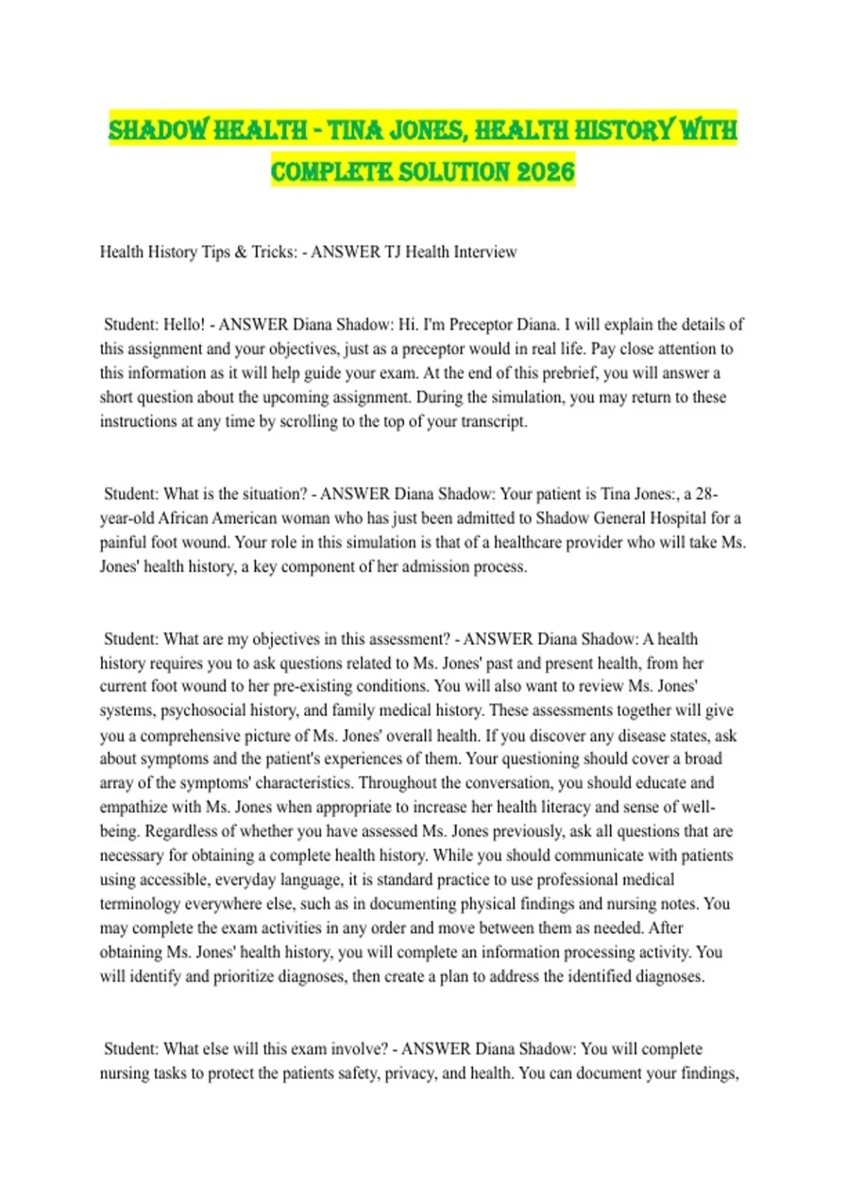 Student: What are my objectives in this assessment? - ANSWER Diana Shadow: A health