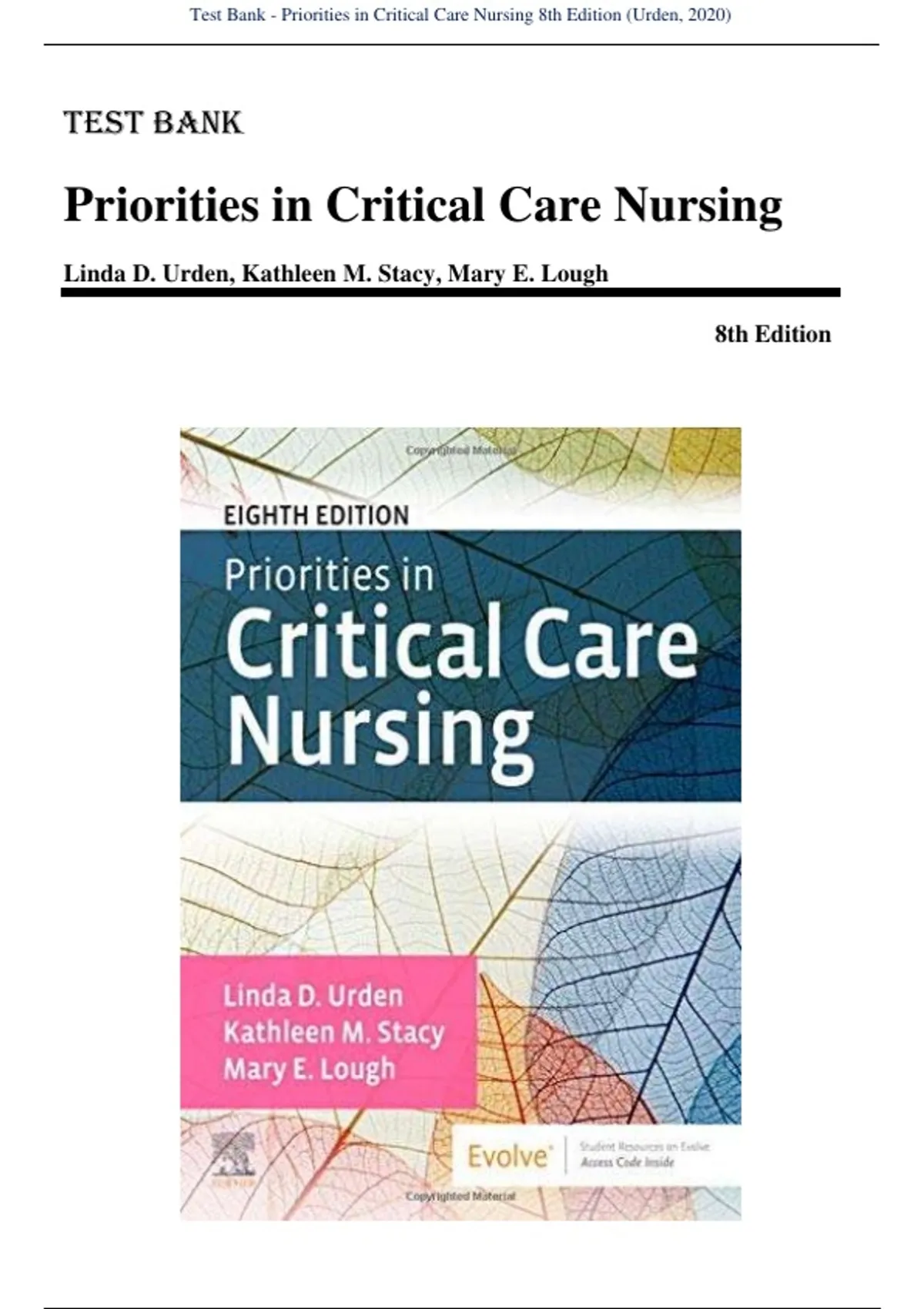 Test Bank for Priorities in Critical Care Nursing 8th Edition by Linda D. Urden, Kathleen M. Stacy, Mary E. Lough This is not a book, but a test bank is a collection of pre-prepared exam questions and answers, designed to help teachers assess students' knowledge and understanding of course material.