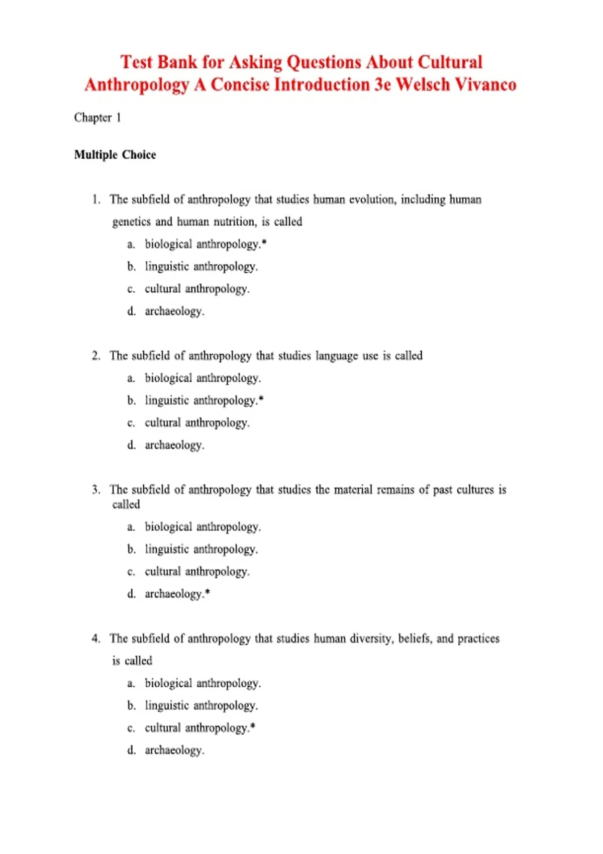Test Bank: Asking Questions About Cultural Anthropology: A Concise Introduction (3rd Edition) – Welsch & Vivanco
