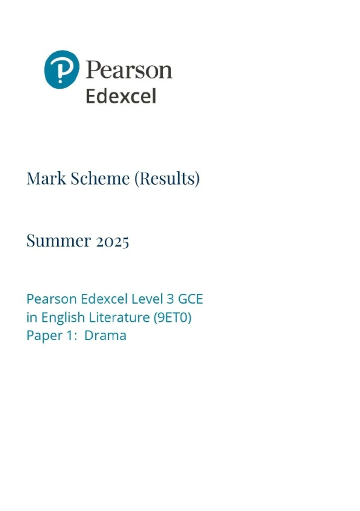 Pearson Edexcellevel 3 GCE MAY 2025 ENGLISH LITERATURE PAPER 1 DRAMA MARKING SCHEME