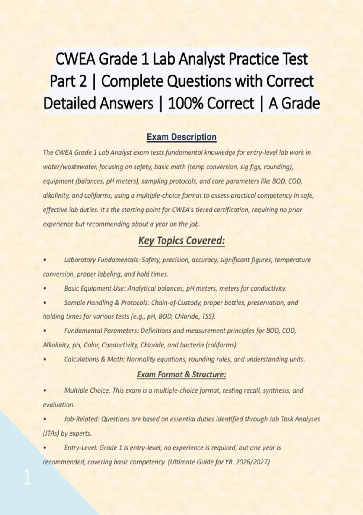 The CWEA Grade 1 Lab Analyst exam tests fundamental knowledge for entry-level lab work in