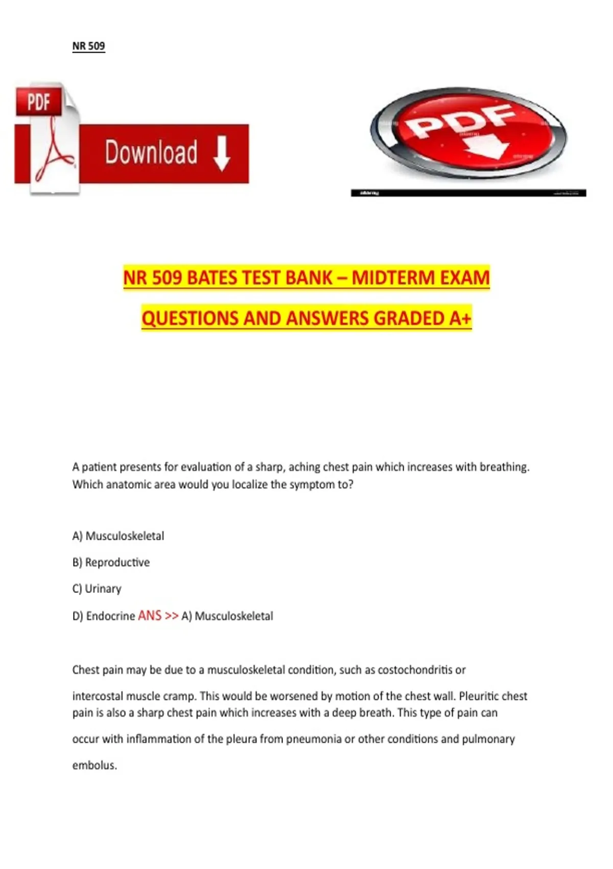 This document contains a comprehensive test bank for the NR 509 midterm exam, including exam-style questions with fully worked answers based on Bates’ Guide to Physical Examination and History Taking. It covers key physical assessment concepts across all body systems and is suitable for exam preparation, practice, and self-testing.
