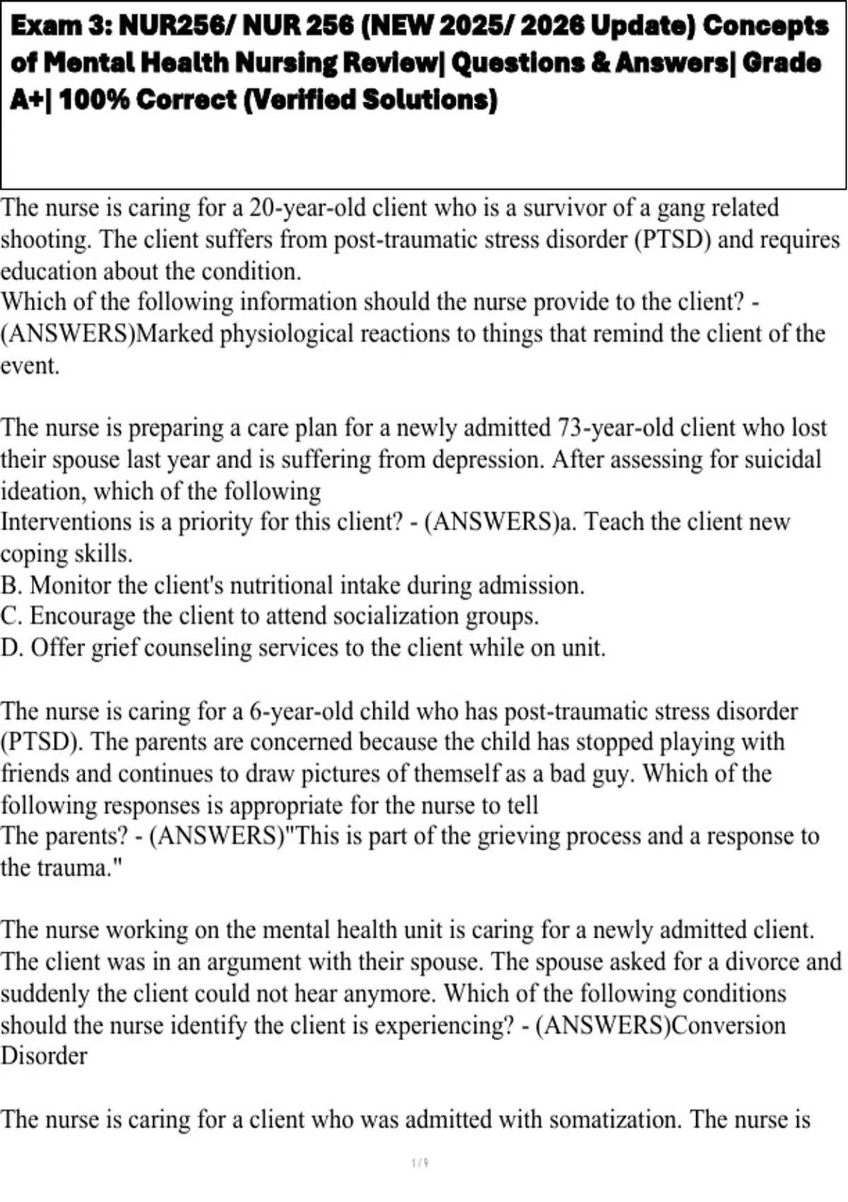 Exam 3: NUR256/ NUR 256 (NEW 2025/ 2026 Update) Concepts of Mental Health Nursing Review| Questions & Answers| Grade A+| 100% Correct (Verified Solutions)