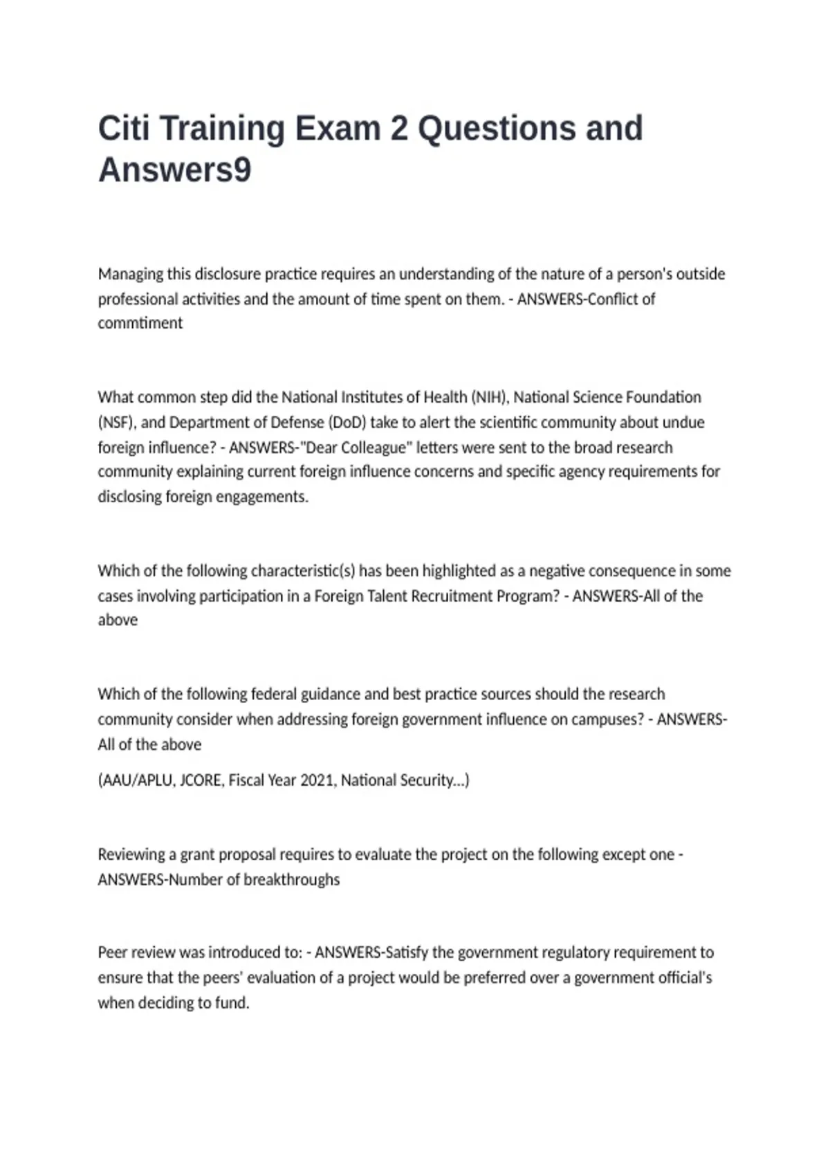 Citi Training Exam 2 Questions and