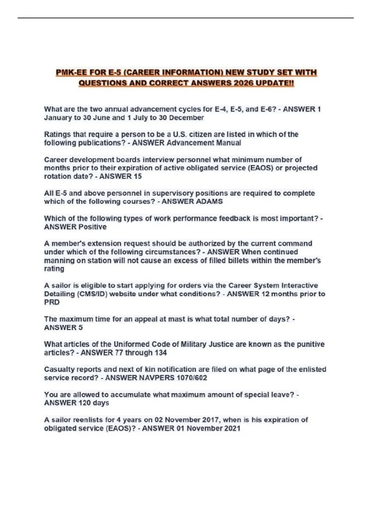PMK-EE FOR E-5 (CAREER INFORMATION) NEW STUDY SET WITH QUESTIONS AND CORRECT ANSWERS 2026 UPDATE!!...