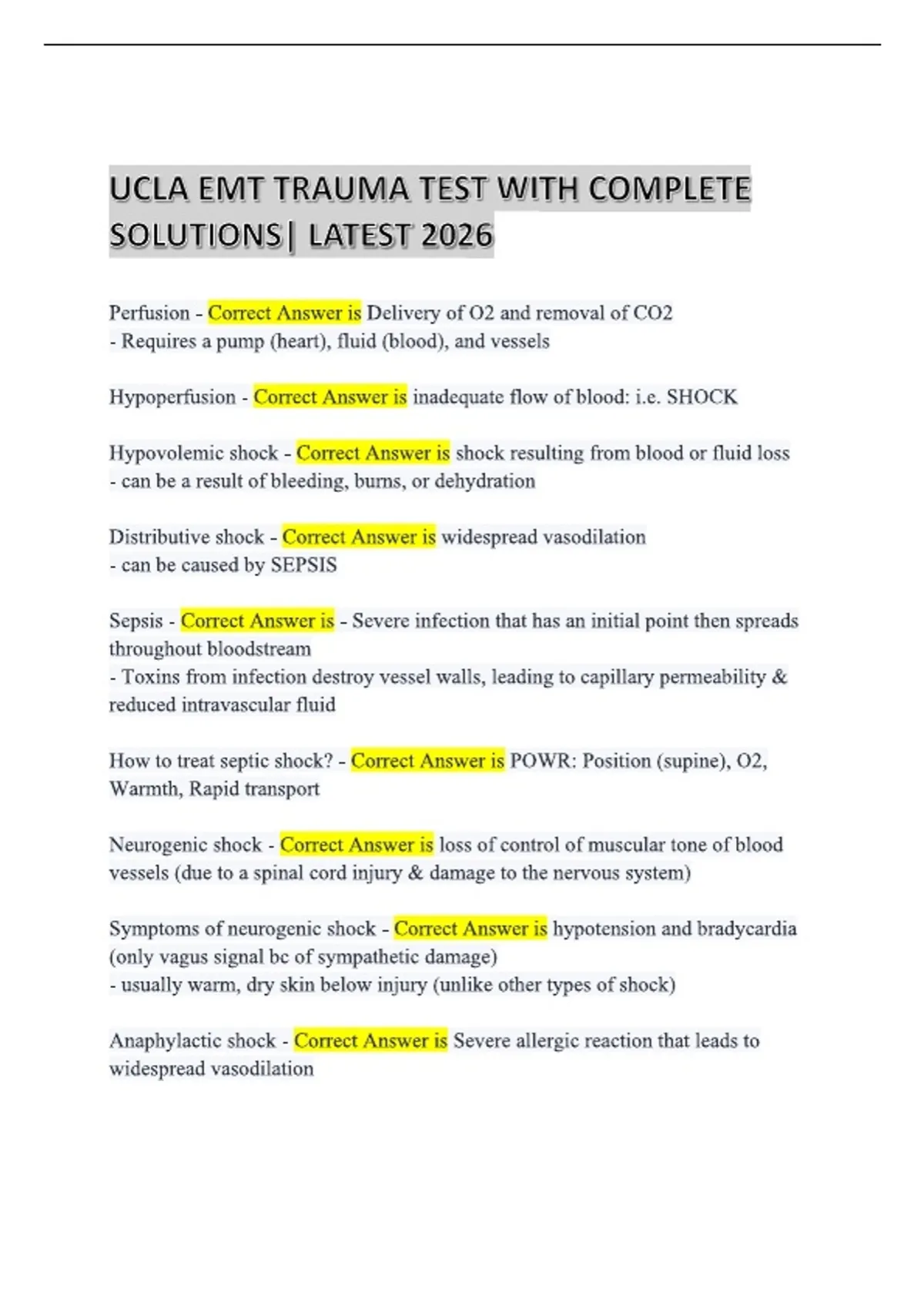 UCLA EMT TRAUMA TEST WITH COMPLETE SOLUTIONS Perfusion - Answer-Delivery of O2 and removal of CO2 - Requires a pump (heart), fluid (blood), and vessels /.Hypoperfusion - Answer-inadequate flow of blood: i.e. SHOCK /.Hypovolemic shock - Answer-shock resulting from blood or fluid loss - can be a result of bleeding, burns, or dehydration /.Distributive shock - Answer-widespread vasodilation - can be caused by SEPSIS /.Sepsis - Answer-- Severe infection that has an initial point then spreads throughout bloodstream - Toxins from infection destroy vessel walls, leading to capillary permeability & reduced intravascular fluid /.How to treat septic shock? - Answer-POWR: Position (supine), O2, Warmth, Rapid transport /.Neurogenic shock - Answer-loss of control of muscular tone of blood vessels (due to a spinal cord injury & damage to the nervous system) /.Symptoms of neurogenic shock - Answer-hypotension and bradycardia (only vagus signal bc of sympathetic damage) - usually warm, dry skin below injury (unlike other types of shock) /.Anaphylactic shock - Answer-Severe allergic reaction that leads to widespread vasodilation /.Anaphylactic shock symptoms - Answer-- Increased vascular permeability - Bronchoconstriction - Stridor - Hives, edema, itching /.4 types of skull fractures - Answer-- linear, depressed, open, basilar /.Linear skull fracture - Answer-A simple crack in the skull - least deadly - most common - usually perpendicular to suture in skull /.Depressed skull fracture - Answer-Inward indentation of the skull with possible pressure on brain - Usually caused from direct trauma to skull (I.e. baseball bat to head) - Will feel abnormal /.Open skull fracture - Answer-a skull fracture with an associated open wound to the overlying scalp - pierced brain cavity - worst injury, most deadly /.Basilar skull fracture - Answer-- Fracture at the base of the skull - leak in cranial vault (usually occurs at high speeds) /.Symptoms of basilar skull fracture (& when will they show up) - Answer-- Raccoon eyes (bruises around/underneath) - Battle's sign: red circular bruises behind ears - Symptoms will usually show up a day after major trauma (takes a while for blood to pool causing symptoms) /.TBI - Answer-Traumatic brain injury: injury capable of producing physical, intellectual, emotional, social, vocation changes /.Primary TBI - Answer-Immediate injury from bruising or penetrating objects /.Secondary TBI - Answer-Injury resulting from hypoxia (lack of perfusion) in the brain /.Epidural hematoma - Answer-- hematoma (bleeding) located superior to the dura mater - results from direct trauma to brain /.symptoms of epidural hematoma - Answer-lucid interval - pt. will usually be knocked unconscious initially, wake up and be able to answer questions, then go unconscious again after pressure builds as a result of bleeding /.What type of bleeding is associated with epidural hematoma - Answer-ARTERIAL- which means it comes on much more quickly than subdural /.Subdural hematoma - Answer-- bleeding beneath dura - usually a result of falls (deceleration forces) /.What type of bleeding is associated with subdural hematoma - Answer-VENOUS - slower formation, symptoms show up hours to days after trauma /.Symptoms of subdural hematoma - Answer-- decreased LOC - slurred speech