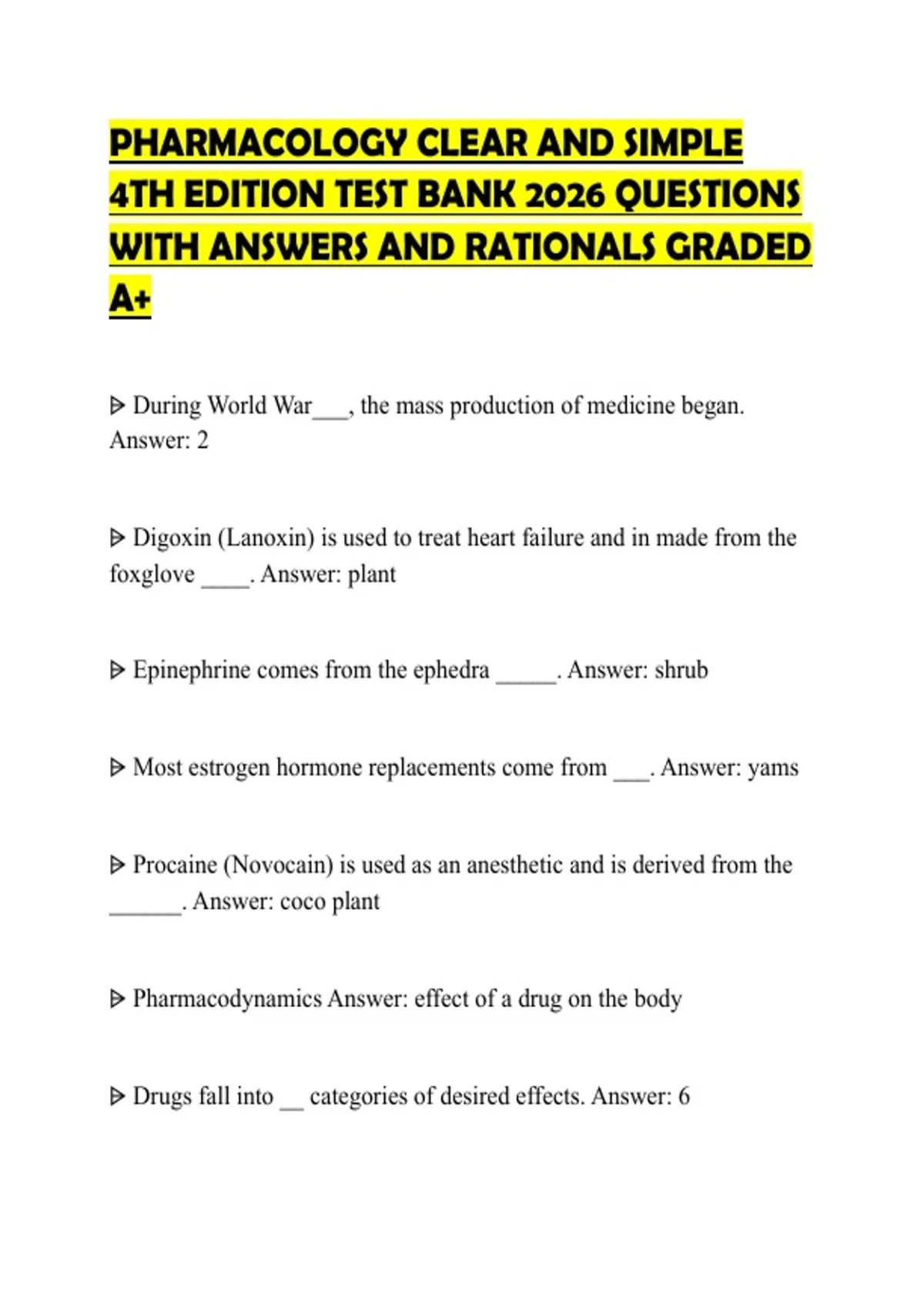 PHARMACOLOGY CLEAR AND SIMPLE 4TH EDITION TEST BANK 2026 QUESTIONS WITH ANSWERS AND RATIONALS GRADED A+