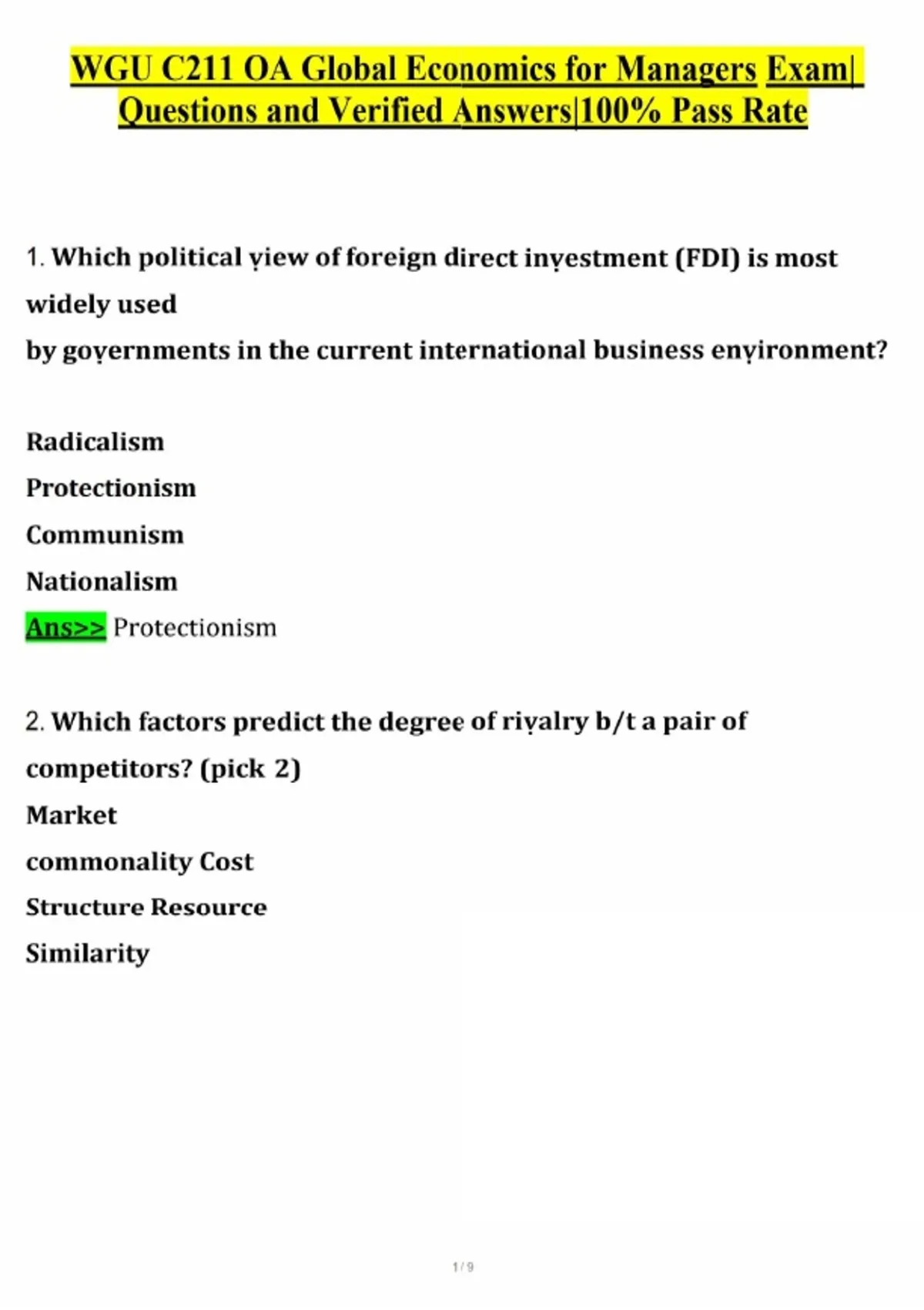 Excel in the WGU C211 Global Economics for Managers Objective Assessment with this 2026 updated exam bank. This resource provides 100% verified answers focused on high-weight domains such as Foreign Direct Investment (FDI) and Gross Domestic Product (GDP) accounting. You will gain technical clarity on political views of FDI, identifying why pragmatic nationalism and protectionism dominate the current international business environment. The guide provides surgical detail on GDP components, explaining why new factory construction is included while stock purchases are not, and how changes in legal frameworks—like the legalization of recreational substances—impact national economic output. From mastering the stages of the Product Life Cycle to predicting exchange rate fluctuations based on supply and demand, this toolkit ensures you possess the analytical depth required to pass your OA on the first attempt.