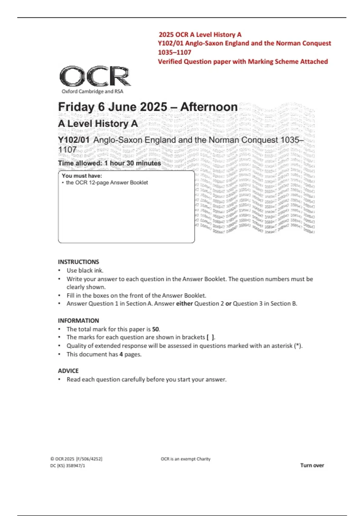 2025 OCR History A Y102/01 Anglo-Saxon England and the Norman Conquest Question Paper | Marking Scheme Attached | Verified