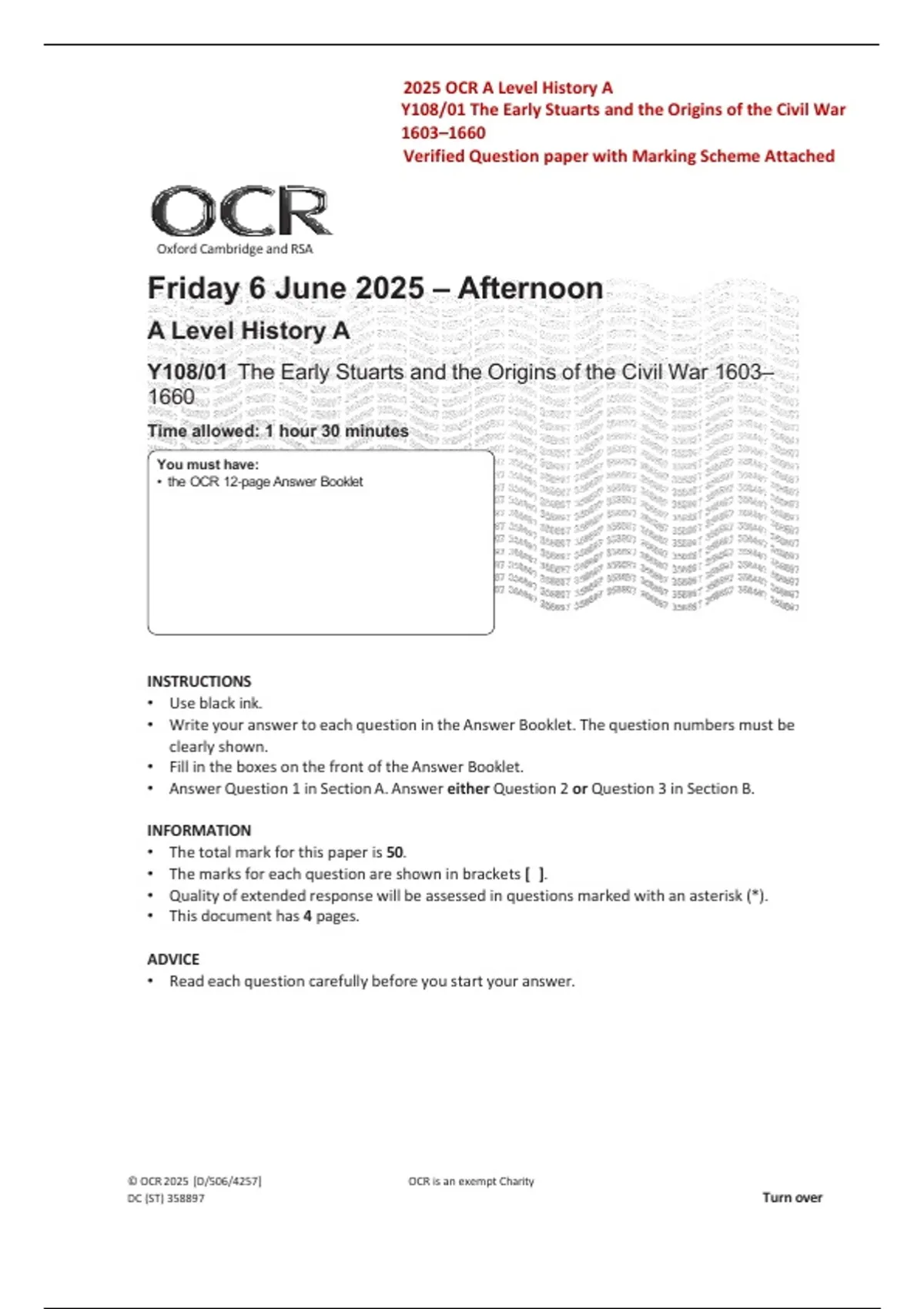 OCR Y108/01 Early Stuarts & Civil War 1603– | Question Paper + Marking Scheme