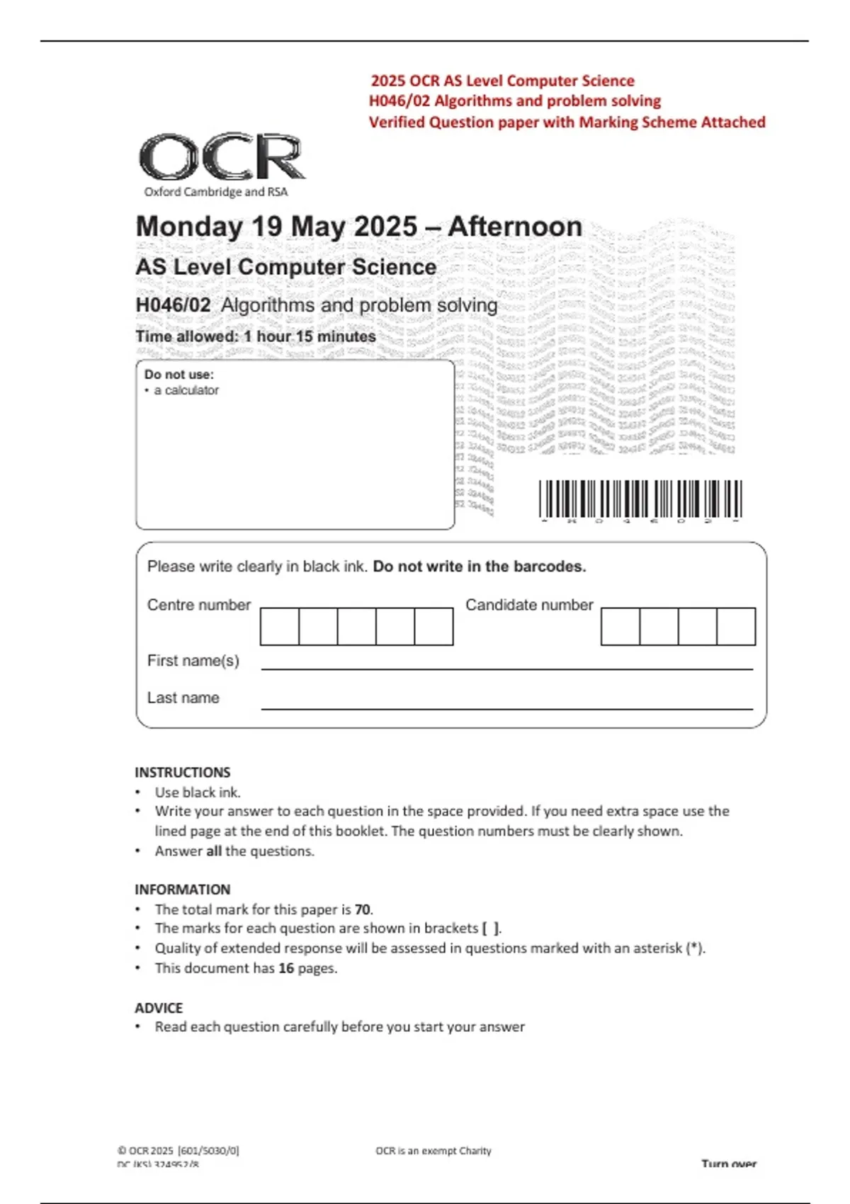 2025 OCR AS Level Computer Science H046/02 Algorithms and Problem Solving exam paper with Official Mark Scheme and verified answers for full exam preparation