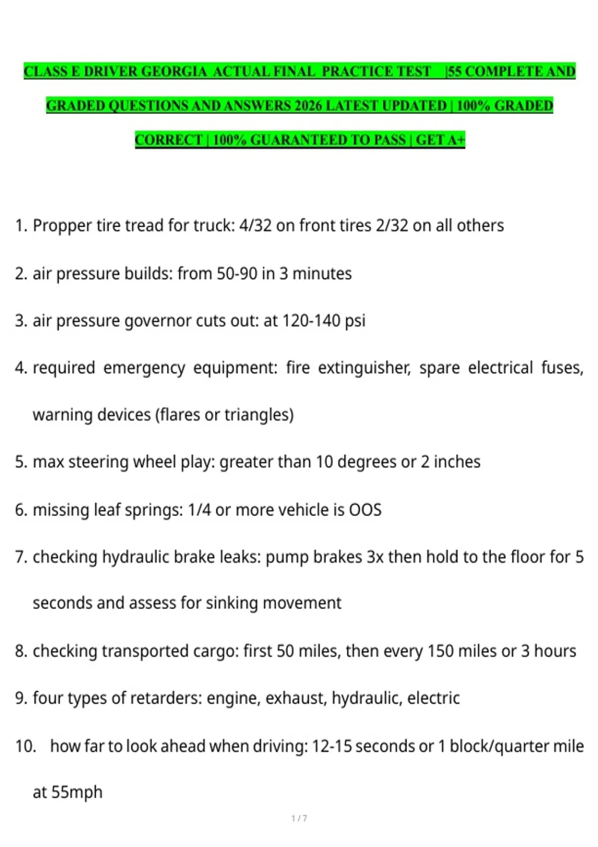 CLASS E DRIVER GEORGIA ACTUAL FINAL PRACTICE TEST |55 COMPLETE AND GRADED QUESTIONS AND ANSWERS 2026 LATEST UPDATED | 100% GRADED CORRECT | 100% GUARANTEED TO PASS | GET A+