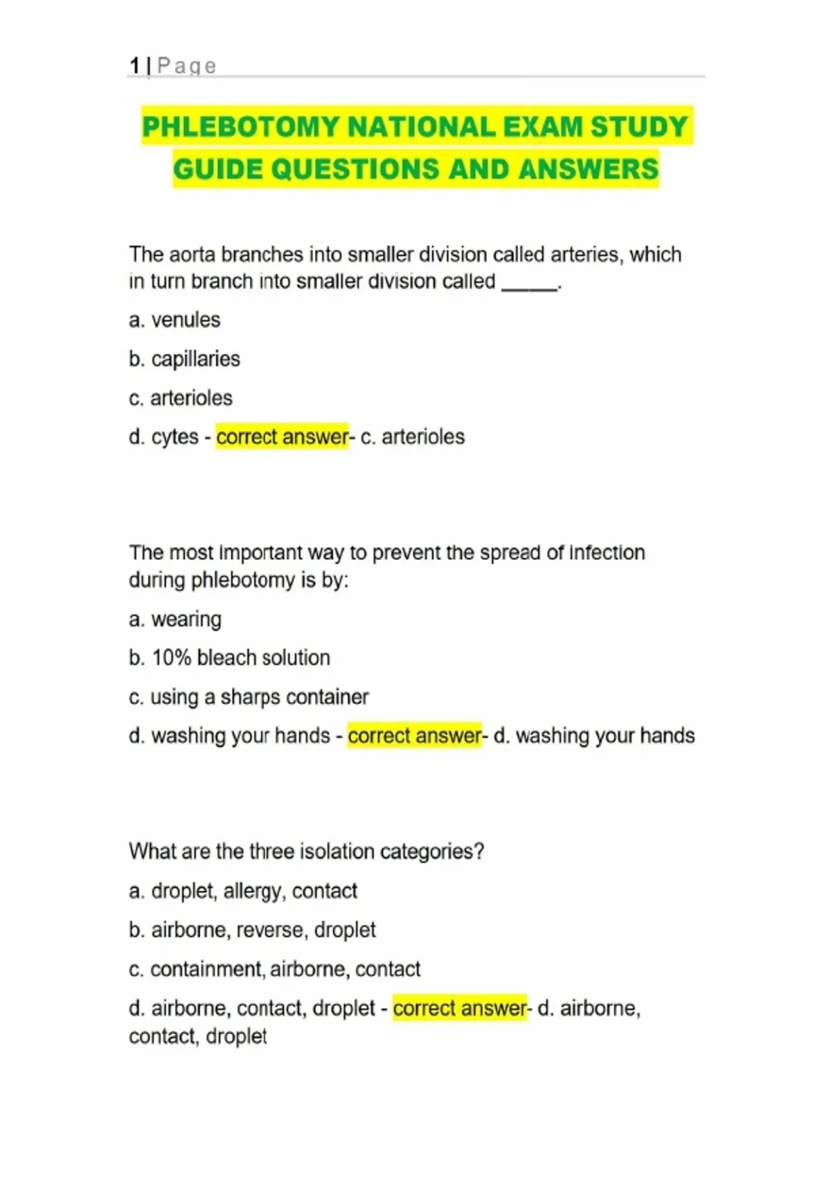 PHLEBOTOMY NATIONAL EXAM STUDY GUIDE QUESTIONS AND ANSWERS.