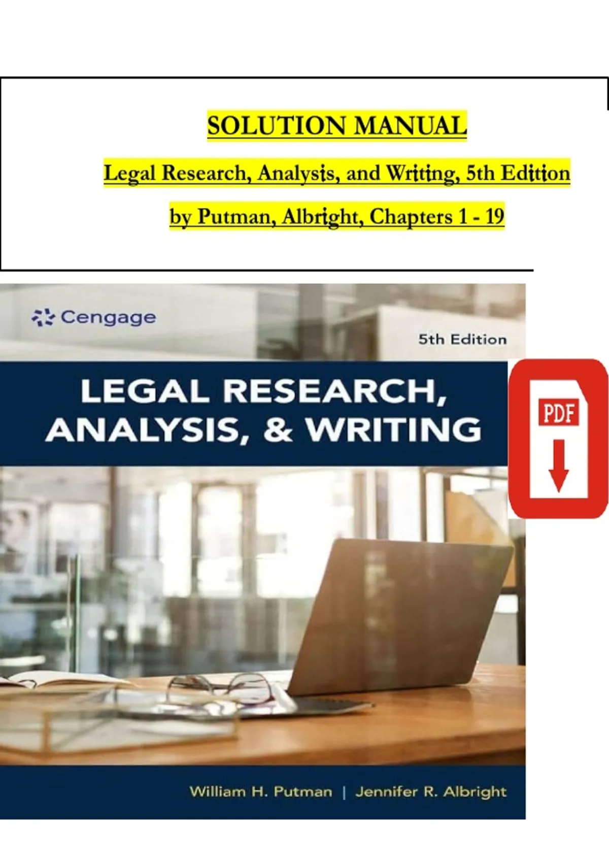 This solutions manual supports Legal Research, Analysis, and Writing, 5th Edition by William H. Putman and Jennifer R. Albright. It includes fully worked, chapter‑by‑chapter solutions for all 19 chapters, aligned with the latest edition used in legal research and writing courses. Coverage includes foundational legal principles and authorities, legal research methods for constitutions and statutes, case law and briefing, secondary authorities, computer and internet research, legal analysis techniques (issue spotting, counteranalysis), and legal writing formats for memoranda, briefs, and correspondence. Designed for paralegal, law, and legal studies students, this resource clarifies problem solutions, reinforces critical research and writing concepts, and supports exam preparation, assignments, and practical skills development. Verified content helps students build confidence in legal reasoning and professional legal communication.