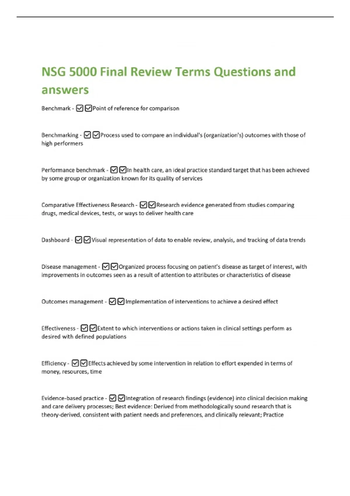 NSG 5000 Final Review Terms Questions and answers Benchmark - Point of reference for comparison Benchmarking - Process used to compare an individual's (organization's) outcomes with those of high performers Performance benchmark - In health care, an ideal practice standard target that has been achieved by some group or organization known for its quality of services Comparative Effectiveness Research - Research evidence generated from studies comparing drugs, medical devices, tests, or ways to deliver health care