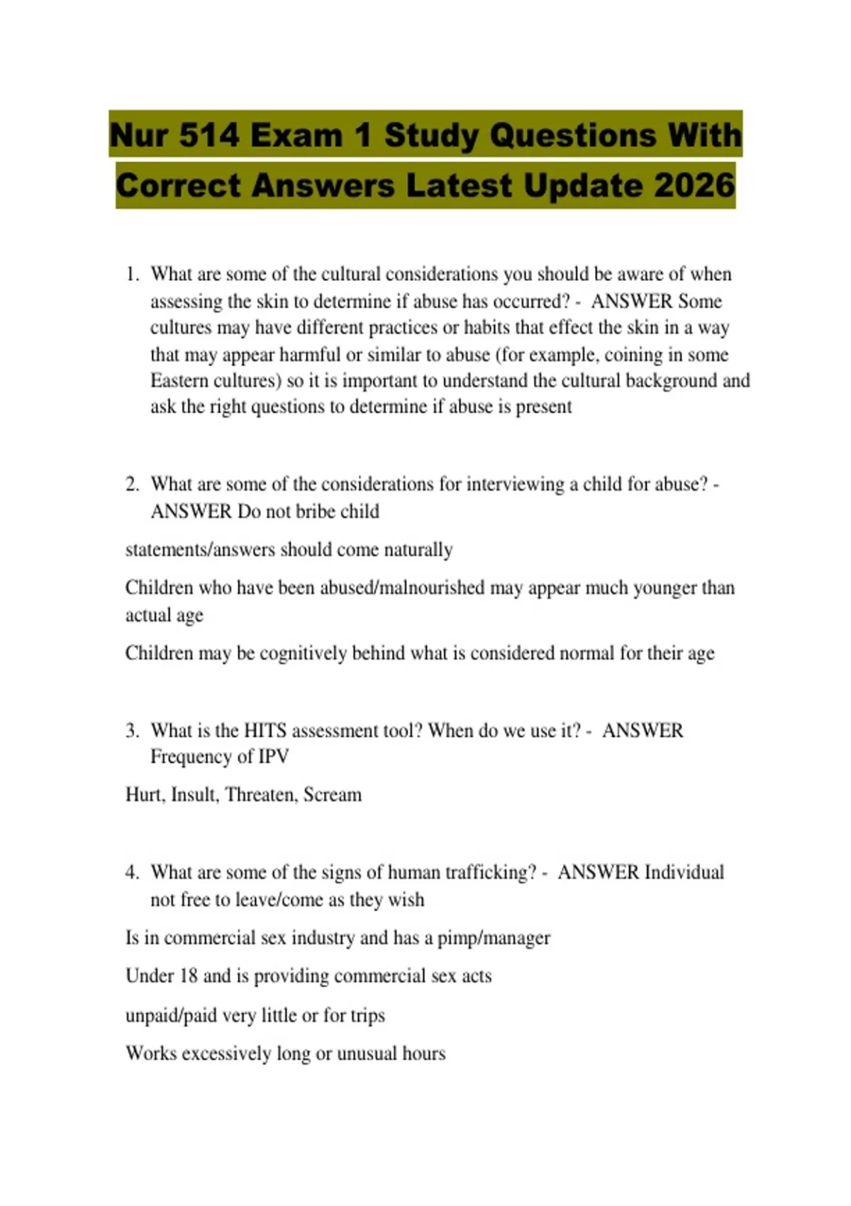 Nur 514 Exam 1 Study Questions With Correct Answers Latest Update 2026 1. What are some of the cultural considerations you should be aware of when assessing the skin to determine if abuse has occurred? - ANSWER Some cultures may have different practices or habits that effect the skin in a way that may appear harmful or similar to abuse (for example, coining in some Eastern cultures) so it is important to understand the cultural background and ask the right questions to determine if abuse is present 2. What are some of the considerations for interviewing a child for abuse? - ANSWER Do not bribe child statements/answers should come naturally Children who have been abused/malnourished may appear much younger than actual age Children may be cognitively behind what is considered normal for their age 3. What is the HITS assessment tool? When do we use it? - ANSWER Frequency of IPV Hurt, Insult, Threaten, Scream 4. What are some of the signs of human trafficking? - ANSWER Individual not free to leave/come as they wish Is in commercial sex industry and has a pimp/manager Under 18 and is providing commercial sex acts unpaid/paid very little or for trips Works excessively long or unusual hours Not allowed breaks Owes a large debt Was recruited through false promises High security measures in the work/living locations Is fearful, anxious, depressed, submissive, tense, nervous, paranoid, fearful/anxious around law enforcement Avoids eye contact Lacks healthcare Appears malnourished Shows signs of physical and/or sexual abuse Has few/no personal possessions Is not in control of their own money Is not in control of IDs Not allowed to speak for themselves Claims of just visiting or unable to claim where they live Lack of knowledge of whereabouts Loss of sense of time Inconsistencies in story 5. What are the long-term consequences of child abuse? - ANSWER Psychological Relationships problems Low self esteem Depression Cognitive problems Social problems Fear Inability to trust Behavioral Pregnancy Tasking seual risks Juvenile delinquency Being a criminal as an adult alcohol/drug abuse Physical HTN, obesity, DM, CV disease Poor brain development Learning difficulties Brain injury/head trauma Lung problems, liver disease, chronic disease Societal High cost of child abuse and fatalities ($124 billion/year) Indirect costs: Increased healthcare system use Mental illness, domestic violence, substance abuse Financial issues Absenteeism from work juvenile/crime activity 6. What are some of the theories of violence? - ANSWER Psychopathy Social learning Biologic Family systems Feminist We should probably expand on these 7. What are some signs of emotional abuse in adults? - ANSWER Constant insults or criticism Blaming victim for things that are not their fault Threaten to hurt children or pets Isolation from supporters (family, friends, coworkers) Deprivation Humiliation Stalking & intimidation Manipulation (ex. Threats of suicide) 8. Which observation of a client should cause the nurse to suspect that the client may be physically abused? - ANSWER Wears long sleeves in warm weather* Speech is slow but with good eye contact Coherent and relaxed speech Well-groomed and dressed 9. A client expresses to the nurse visiting her home that her husband has threatened to kill her. The nurse understands that threats of harm and intimidation are which type of abuse? - ANSWER Economic Psychological* Sexual Physical 10. The nurse assesses a client who was physically assaulted by his brother. The nurse learns that the client has been punched and kicked. After marking the area of injury on the body map what score should the nurse document for this abuse? - ANSWER 5 3* 4 1 11. What are some cultural considerations when performing the physical assessment? - ANSWER In some cultures, female patients prefer a female nurse/physician 12. What are some cultural considerations when assessing the skin- hair- nails? Head and neck? Eyes? Ears? Mouth? - ANSWER Head & neck: In US, traumatic brain injuries are very common Mouth: oral diseases are prevalent in poorer population in developed/developing countries Dental caries, periodontal disease, tooth loss, oral mucosal, oropharyngeal lesions, cancer, HIV & trauma Skin, hair, nails Fair skinned people (especially w/ light eyes and freckles) are higher risk for skin cancer Darker skinned people more at risk for postinflammatory hyperpigmentation, vitiligo, pityriasis alba, dry/ashy skin, dermatosis papulosangria, keloid & keloid-like acne, hair loss (African, Native, Asians, latinos, hispanics) Eyes Looks at visual impairment across the ages (>50, more in females) and geography Highly developed countries you see cataracts as leading cause followed by glaucoma, & age-related macular degeneration Ears Genetic causes, complications at birth, certain infectious diseases, chronic ear infections, use of drugs, exposure to excessive noise & aging