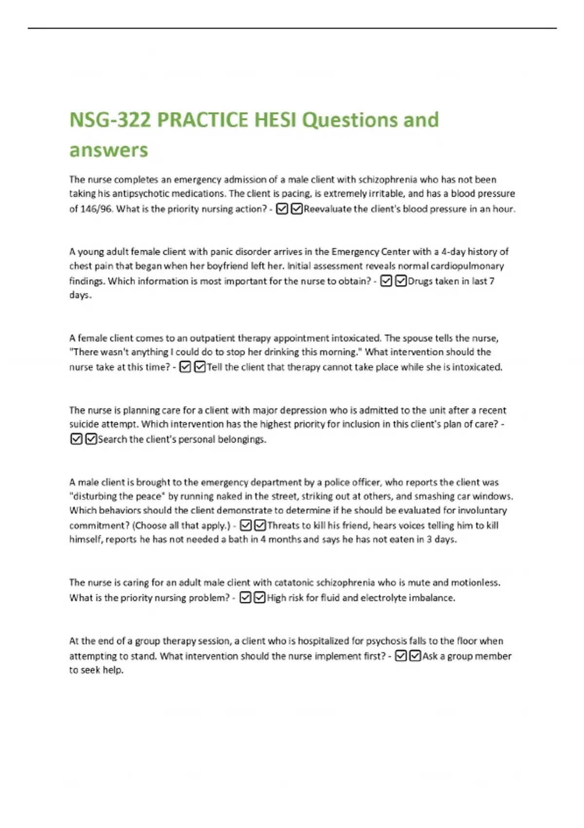 NSG-322 PRACTICE HESI Questions and answers The nurse completes an emergency admission of a male client with schizophrenia who has not been taking his antipsychotic medications. The client is pacing, is extremely irritable, and has a blood pressure of 146/96. What is the priority nursing action? - Reevaluate the client's blood pressure in an hour. A young adult female client with panic disorder arrives in the Emergency Center with a 4-day history of chest pain that began when her boyfriend left her. Initial assessment reveals normal cardiopulmonary findings. Which information is most important for the nurse to obtain? - Drugs taken in last 7 days.