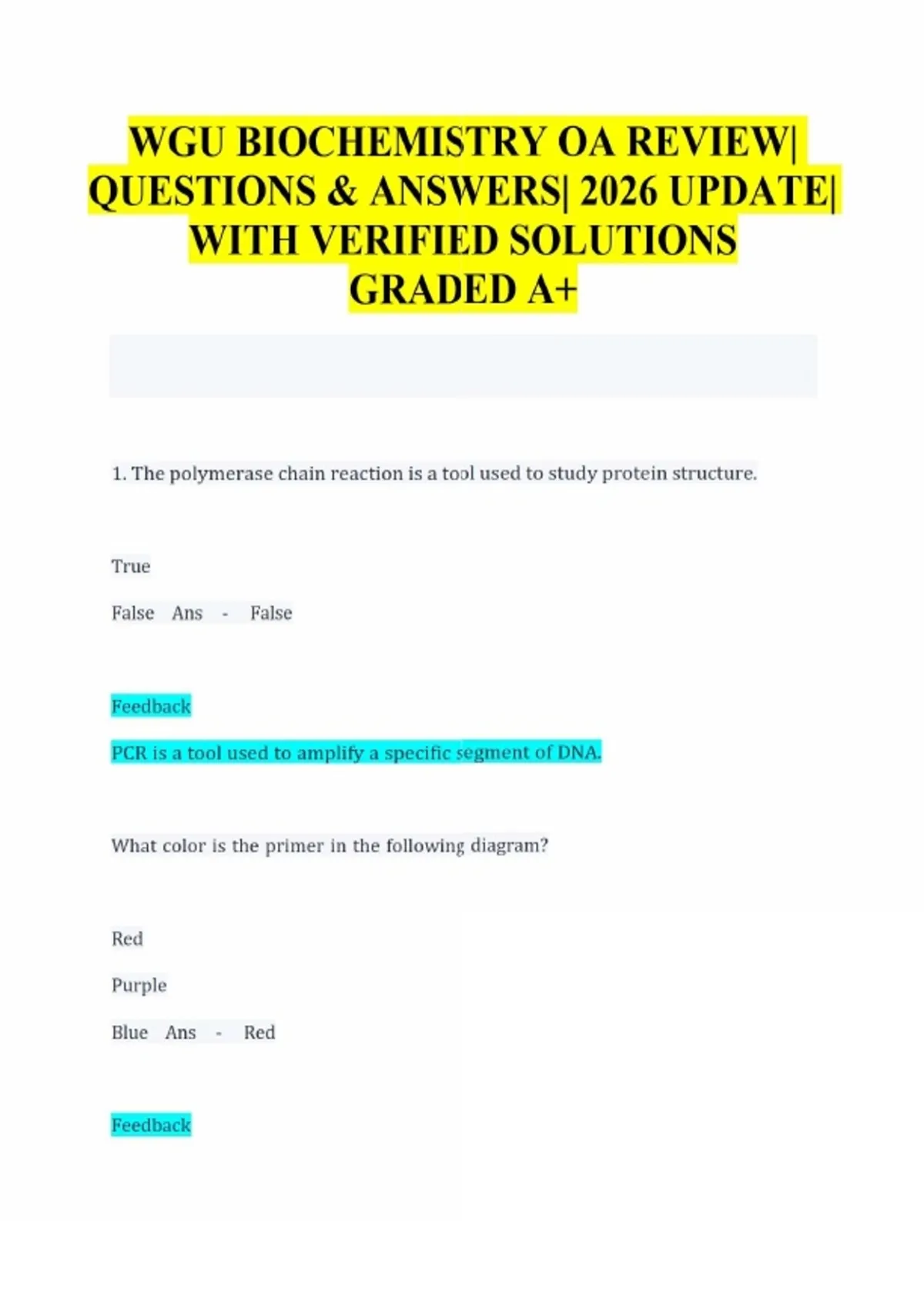 Master the molecular complexities of WGU C785 Biochemistry with this 2026/2027 updated exam bank. This resource provides expert-verified questions and answers that target the most heavily weighted domains of the Objective Assessment. You will gain technical clarity on the mechanics of the Polymerase Chain Reaction (PCR), from primer annealing to the function of dNTPs in DNA synthesis. The guide provides surgical detail on metabolic pathways, explaining how cells maintain ATP production through fermentation and the vital regeneration of NAD+ during anaerobic conditions. From understanding the conversion of pyruvate to lactate in muscle cells to mastering the role of thermocyclers in genomic amplification, this toolkit ensures you possess the clinical and biochemical depth required for success. These verified solutions provide the pedagogical support necessary to pass your OA on the first attempt.