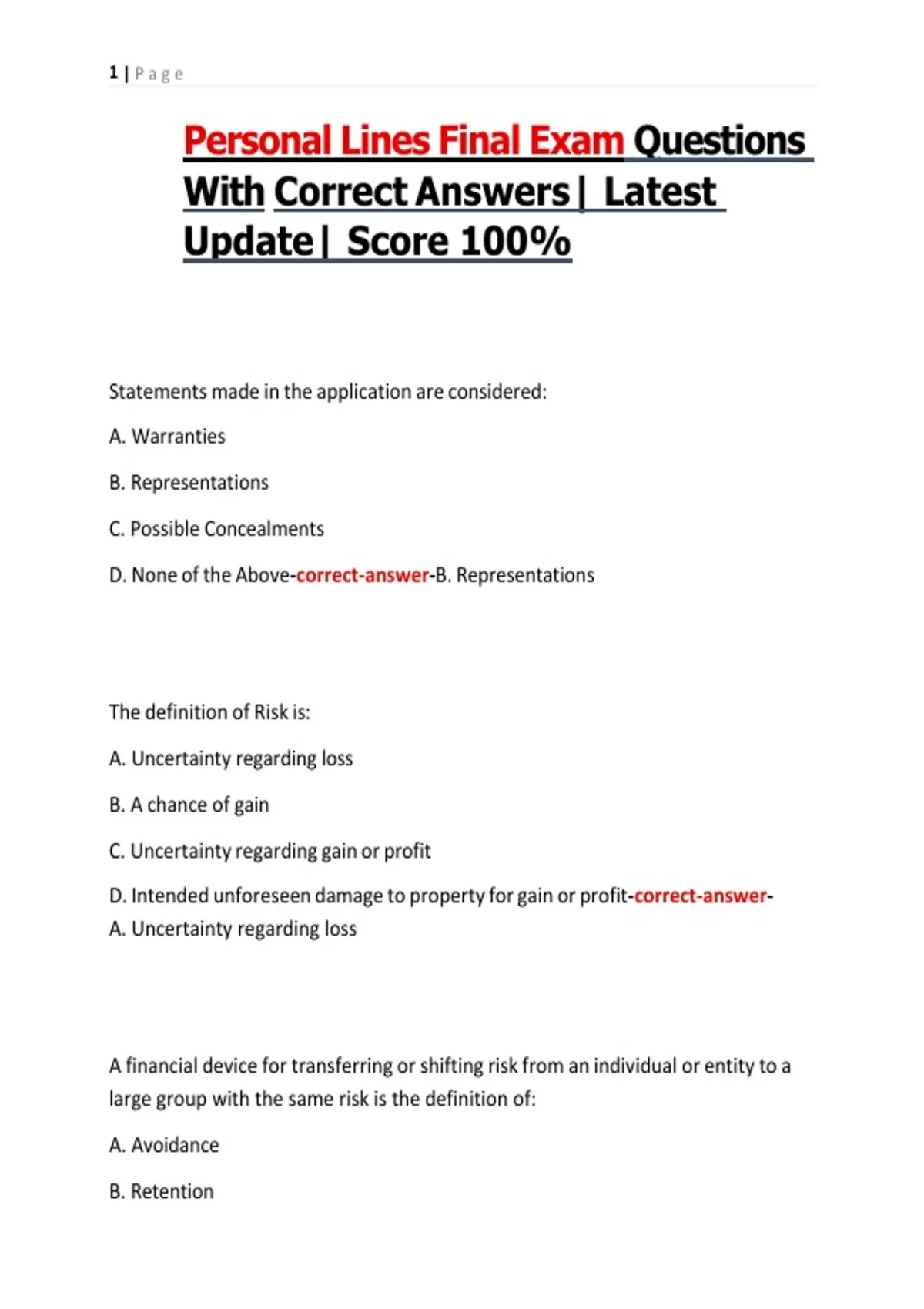 Personal Lines Final Exam Questions With Correct Answers| Latest Update| Score 100%
