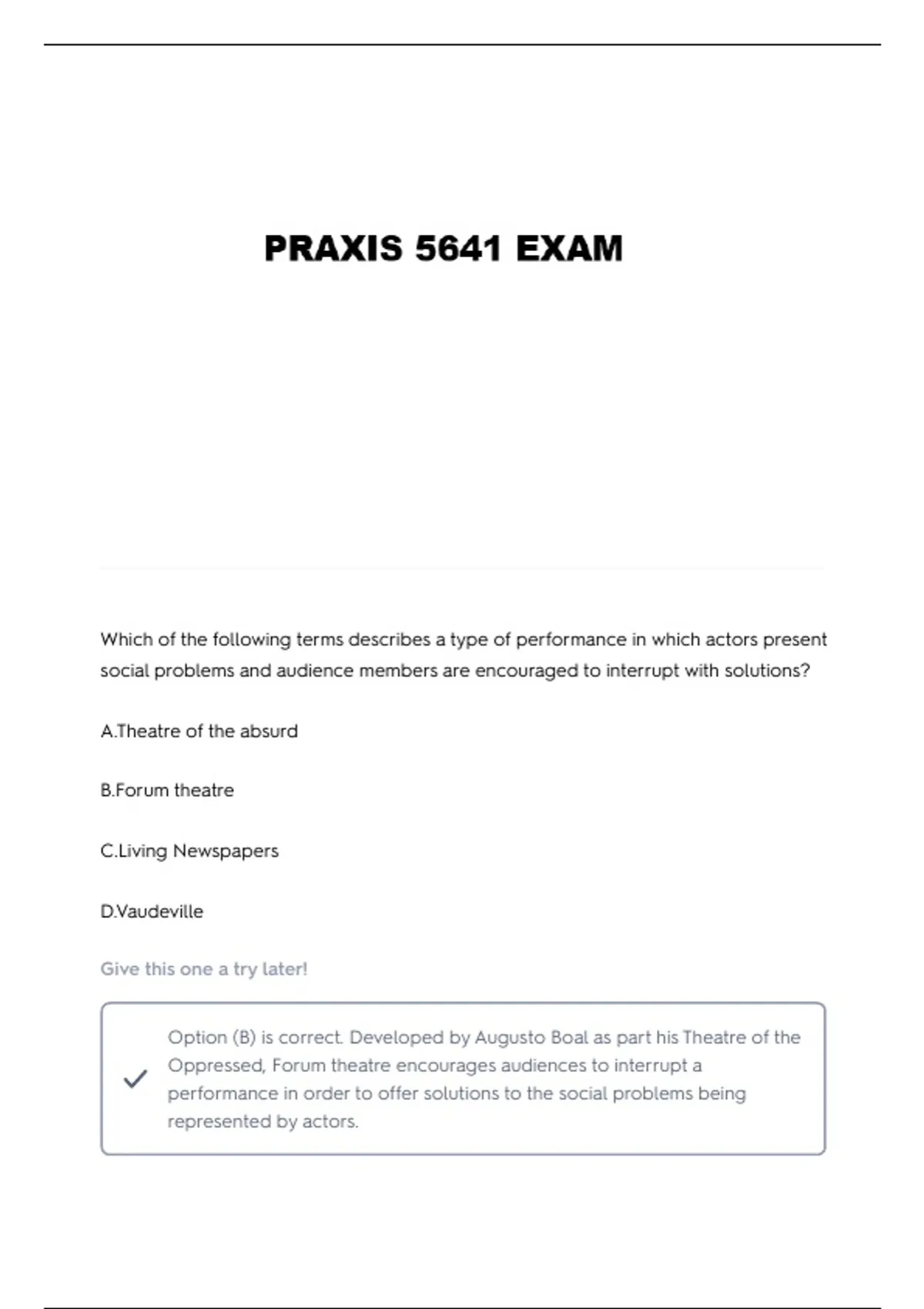 Option (B) is correct. Developed by Augusto Boal as part his Theatre of the