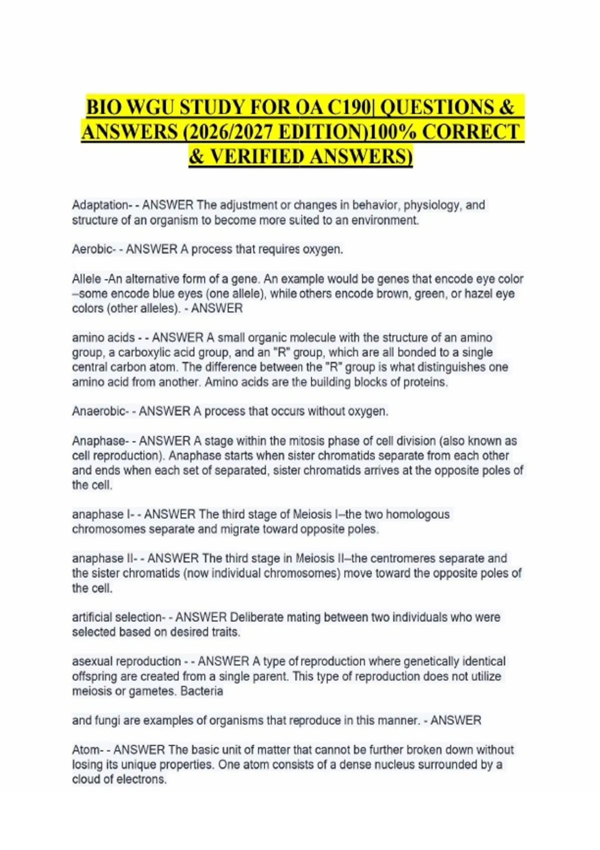 Master the fundamental principles of life sciences with this 2026/2027 updated study guide for WGU C190 Introduction to Biology. This comprehensive resource features expert-verified definitions and concepts essential for passing the Objective Assessment. You will gain technical clarity on cellular reproduction, mastering the distinct stages of mitosis and meiosis, including the critical separation of chromosomes in Anaphase. The guide provides surgical detail on molecular biology, defining the structure of amino acids, the function of nonpolar lipids like waxes, and the process of translation from RNA to protein. From understanding genetic alleles to navigating the energy dynamics of trophic levels in an ecosystem, this toolkit ensures you possess the scientific literacy required for success. These verified solutions provide the pedagogical support necessary to secure a pass on your first attempt.