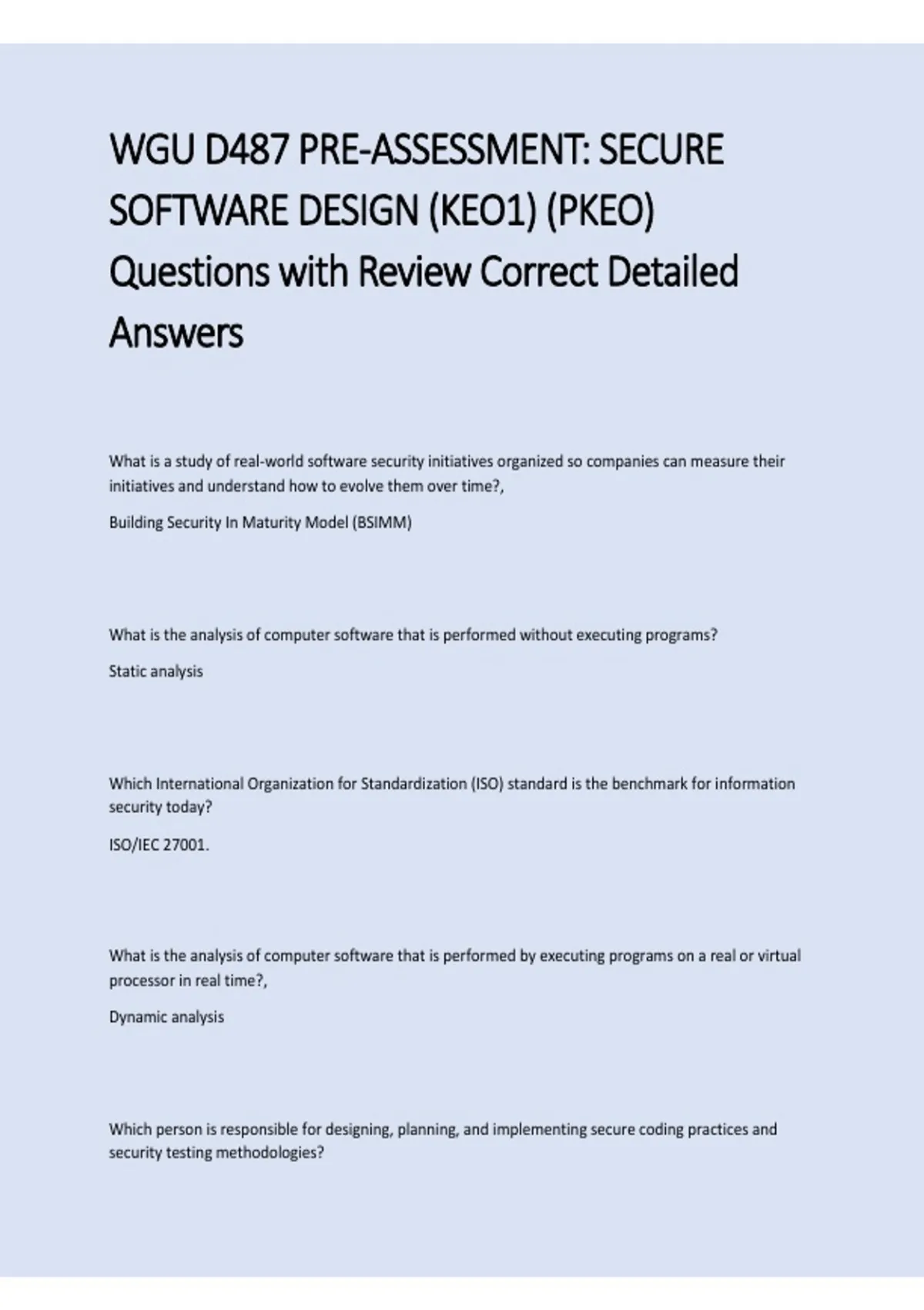 Prepare for the WGU D487 Pre-Assessment in Secure Software Design (KEO1/PKEO) with verified questions and answers. This 2025–2026 resource includes exam-style questions with clear rationales, covering secure coding principles, software design practices, risk mitigation, and security protocols to help students master key concepts and confidently succeed in the WGU D487 assessment.