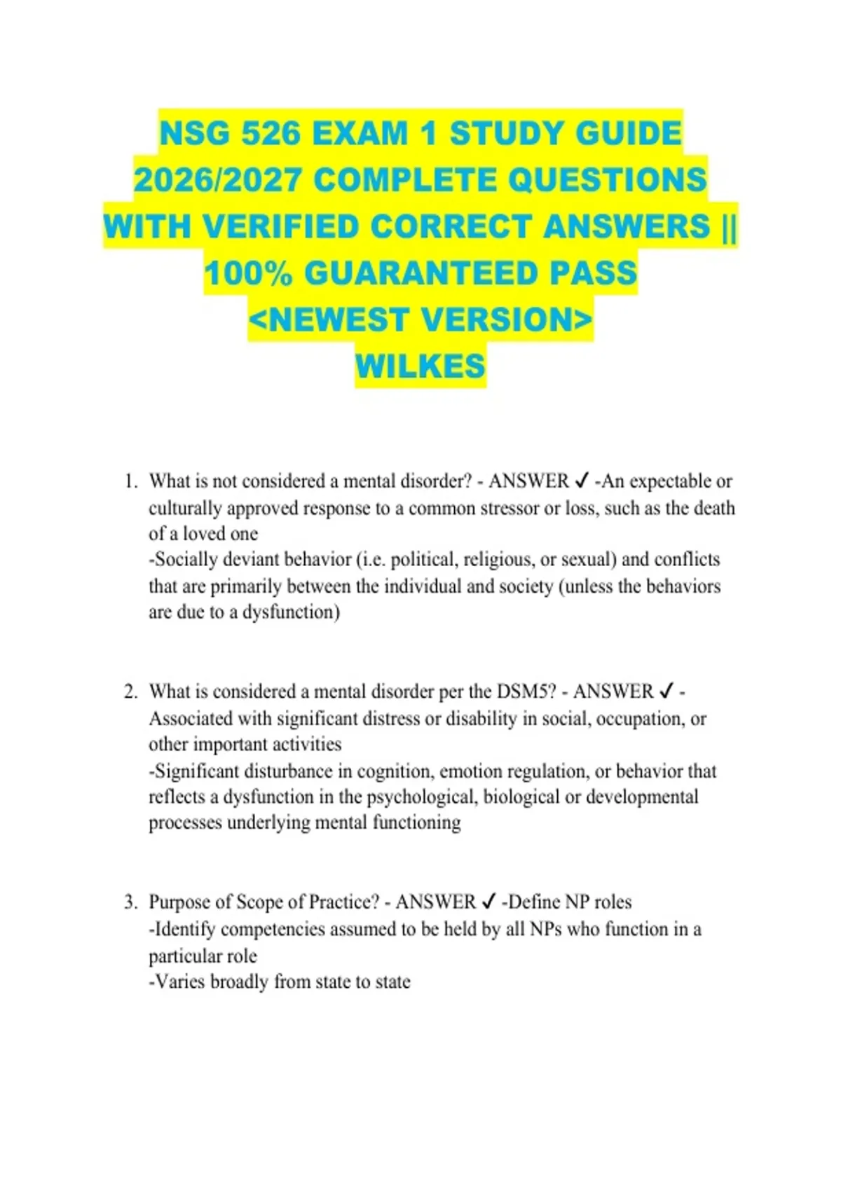 NSG 526 EXAM 1 STUDY GUIDE 2026/2027 COMPLETE QUESTIONS WITH VERIFIED CORRECT ANSWERS || 100% GUARANTEED PASS &lt;NEWEST VERSION&gt; WILKES 1. What is not considered a mental disorder? - ANSWER -An expectable or culturally approved response to a common stressor or loss, such as the death of a loved one -Socially deviant behavior (i.e. political, religious, or sexual) and conflicts that are primarily between the individual and society (unless the behaviors are due to a dysfunction) 2. What is considered a mental disorder per the DSM5? - ANSWER Associated with significant distress or disability in social, occupation, or other important activities -Significant disturbance in cognition, emotion regulation, or behavior that reflects a dysfunction in the psychological, biological or developmental processes underlying mental functioning 3. Purpose of Scope of Practice? - ANSWER -Define NP roles -Identify competencies assumed to be held by all NPs who function in a particular role -Varies broadly from state to state 4. Purpose of Standard of Practice? - ANSWER -Authoritative statements regarding the quality and type of practice that should be provided -Provide a way to judge the nature of care provided -Reflect the expectation for the care that should be provided to clients with various illnesses -Reflect professional agreement focused on the minimum levels of acceptable performance -Can be used to legally describe the standard of care that must be met by a provider -May be precise protocols that must be followed or more general guidelines that recommend actions 5. Purpose of Psychiatric Interview? - ANSWER Understand the patient's illness to evaluate the effect on their lives and create a beginning diagnosis and treatment plan 6. Psychosexual stage: Oral? - ANSWER -Birth to 18 months -Focused on oral pleasures (sucking) -Too much or too little can result in oral fixation or oral personality, which is evidence by preoccupation with oral activities -May have stronger tendency to smoke, drink alcohol, over eat, or bite nails - Potential personality: overly dependent, gullible, perpetual followers, pessimism, aggression 7. Psychosexual stage: Anal? - ANSWER -18 months to 3 yrs -Focused on eliminating and retaining feces -Learn to control anal stimulation through pressure from society -Potential personality: obsession with cleanliness, perfection, controlling (anal retentive), messy, disorganized (anal expulsive) 8. Psychosocial stage: Phallic - ANSWER -3 yrs to 6 yrs -Pleasure zone switches to genitals -Boys may develop unconscious sexual desires for their mother, which can result in seeing father as competition. Will fight for mothers affection -Oedipus complex: fear of castration as punishment for having these feelings (can be opposite with girls) -When the boy identifies with father, they become masculine, identifies as males, repress sexual feelings towards mother -A fixation in this stage can cause sexual deviancies, weak/confused sexual identity 9. Psychosocial stage: Latency? - ANSWER -6 to 12 yrs -sexual urges remain represses -children interact and play mostly with same sex peers 10. Hildegard Peplau - ANSWER Theory of Interpersonal Relations. Earliest modern nursing theory Enabled nursing to establish the groundwork for Advanced Practice Nursing. Therapeutic communication. 11. Psychotherapy - ANSWER Holistic treatment that relies on the nurse's processing of what the patient is experiencing 12. During the psychotherapy process the Psych APN: - ANSWER Addresses individual and family problems with the patient Assesses identified problems during the orientation phase of the therapeutic relationship Determines the underlying healthcare issues with the patient Collects psychiatric data Establishes a trusting relationship 13. Interpersonal Therapy Goals - ANSWER Focus on difficulties patients are experiencing in current relationships and the ways relationships can be handled Change pattern of communication To alter expectations within relationships To use social supports to help patients deal with stressors and improve their environment To relieve symptoms To build social skills 14. Interpersonal Therapy Indications - ANSWER Complicated bereavement/grief Marital and interpersonal conflicts such as role disputes Life events such as role transitions Isolation, lack of support, interpersonal deficits 15. Early Phase of Interpersonal Therapy - ANSWER Therapist identifies depressive symptoms, evaluates patient, generates a diagnosis, takes an interpersonal inventory -nature of interactions with others -identification of reciprocal relationships and determination if needs were satisfied -Discussion of satisfying and dissatisfying aspects of the relationship -recent changes in key relationships -changes patient desires in relationships 16. Middle Phase of Interpersonal Therapy - ANSWER Patient and therapist derive more specific strategies to deal with stressors 17. Termination Phase Interpersonal Therapy - ANSWER Consolidate gains Foster independence in the person