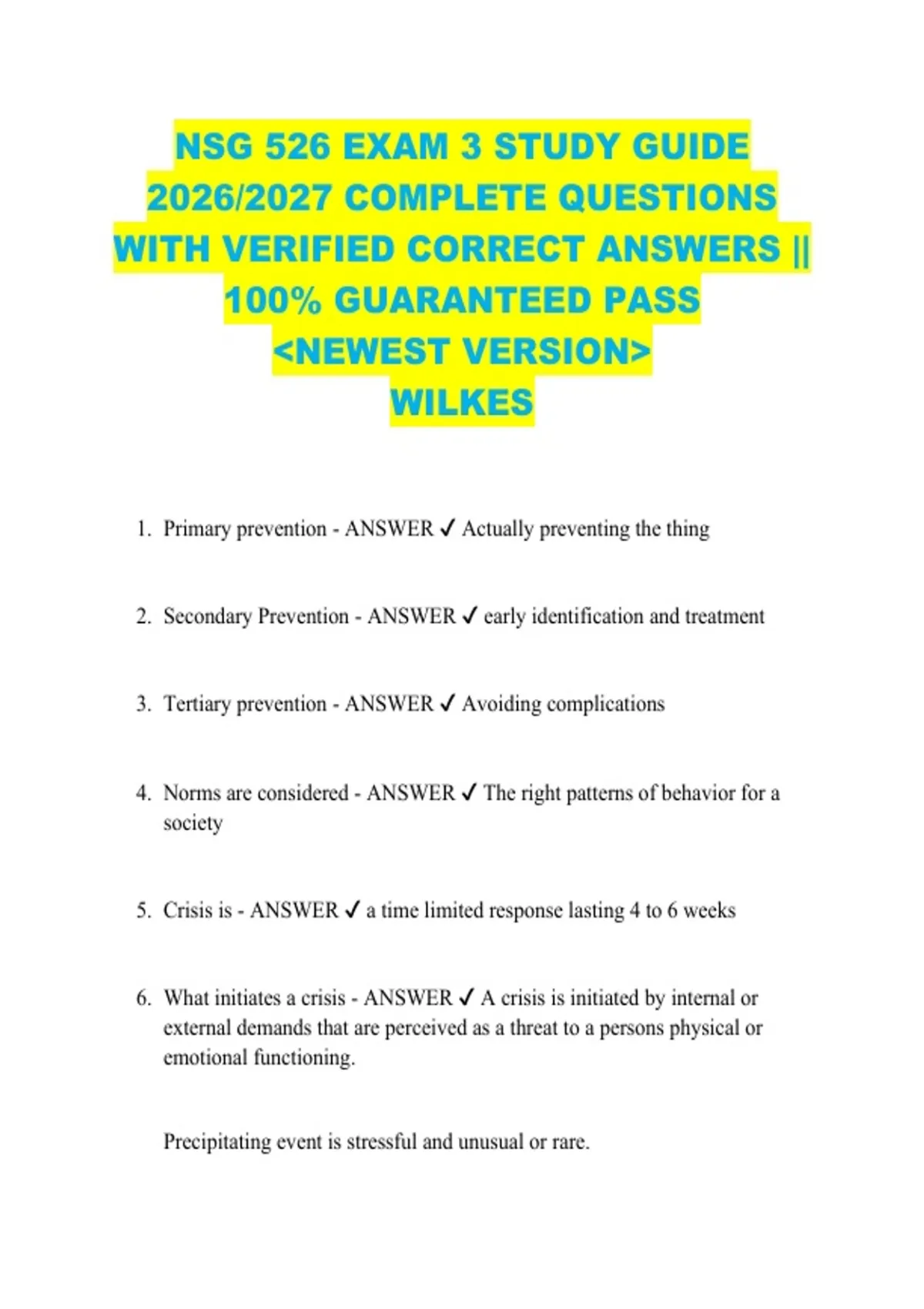 5. Crisis is - ANSWER ✔ a time limited response lasting 4 to 6 weeks