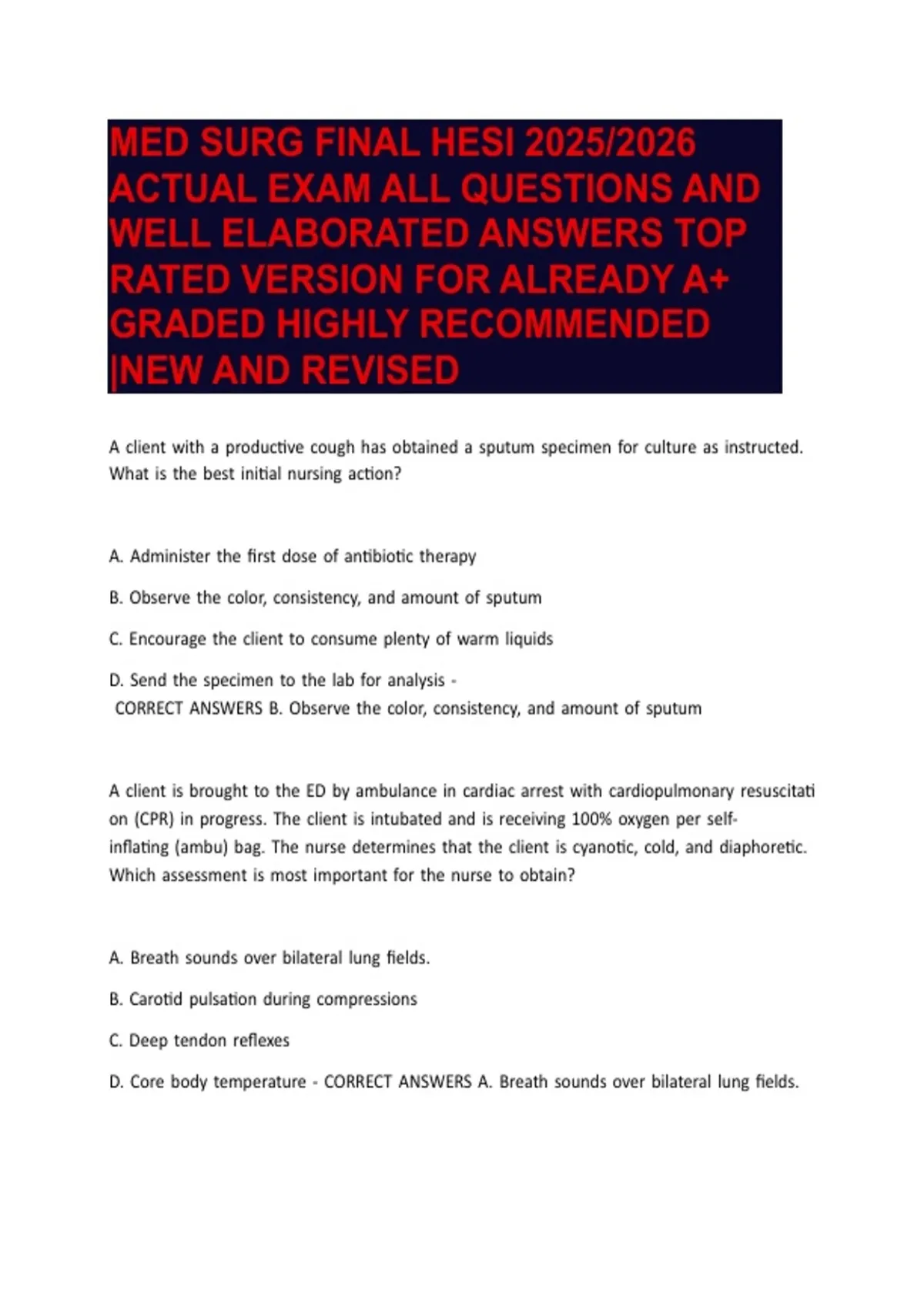 MED SURG FINAL HESI 2025/2026 ACTUAL EXAM ALL QUESTIONS AND WELL ELABORATED ANSWERS TOP RATED VERSION FOR ALREADY A+ GRADED HIGHLY RECOMMENDED |NEW AND REVISED
