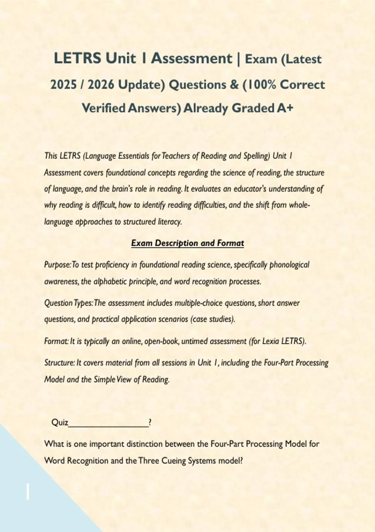 Format: It is typically an online, open-book, untimed assessment (for Lexia LETRS).