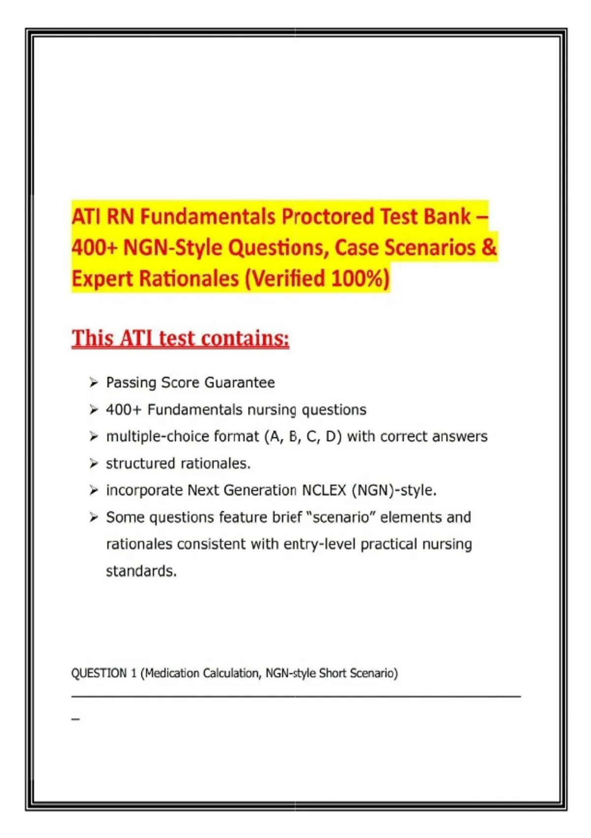 ATI RN Fundamentals Proctored Test Bank – 400+ NGN Style Questions, Case Scenarios & Expert Rationales (Verified 100)_ This ATI RN Fundamentals Proctored Test Bank is a comprehensive exam prep resource designed to help nursing students master the ATI RN Fundamentals exam and prepare for the Next Generation NCLEX (NGN). It contains 400+ verified multiple‑choice questions with structured rationales and case scenarios, ensuring students build confidence and achieve passing scores. What’s Inside: - 400+ Fundamentals Nursing Questions – Multiple‑choice format (A, B, C, D) with correct answers. - NGN‑Style Case Scenarios – Realistic exam practice aligned with NCLEX standards. - Expert Rationales – Clear explanations for every answer to strengthen understanding. - Passing Score Guarantee – Verified content designed to maximize exam success. - Coverage of Key Domains – Medication calculations, therapeutic communication, safety, restraints, geriatric care, grief stages, ethics, IV therapy, and more. Key Benefits: - Provides realistic NGN‑style practice for NCLEX‑RN readiness. - Covers all ATI RN Fundamentals domains in one complete test bank. - Helps students achieve a Level 2 or higher on ATI exams. - Perfect for ATI prep, NCLEX review, and nursing school success