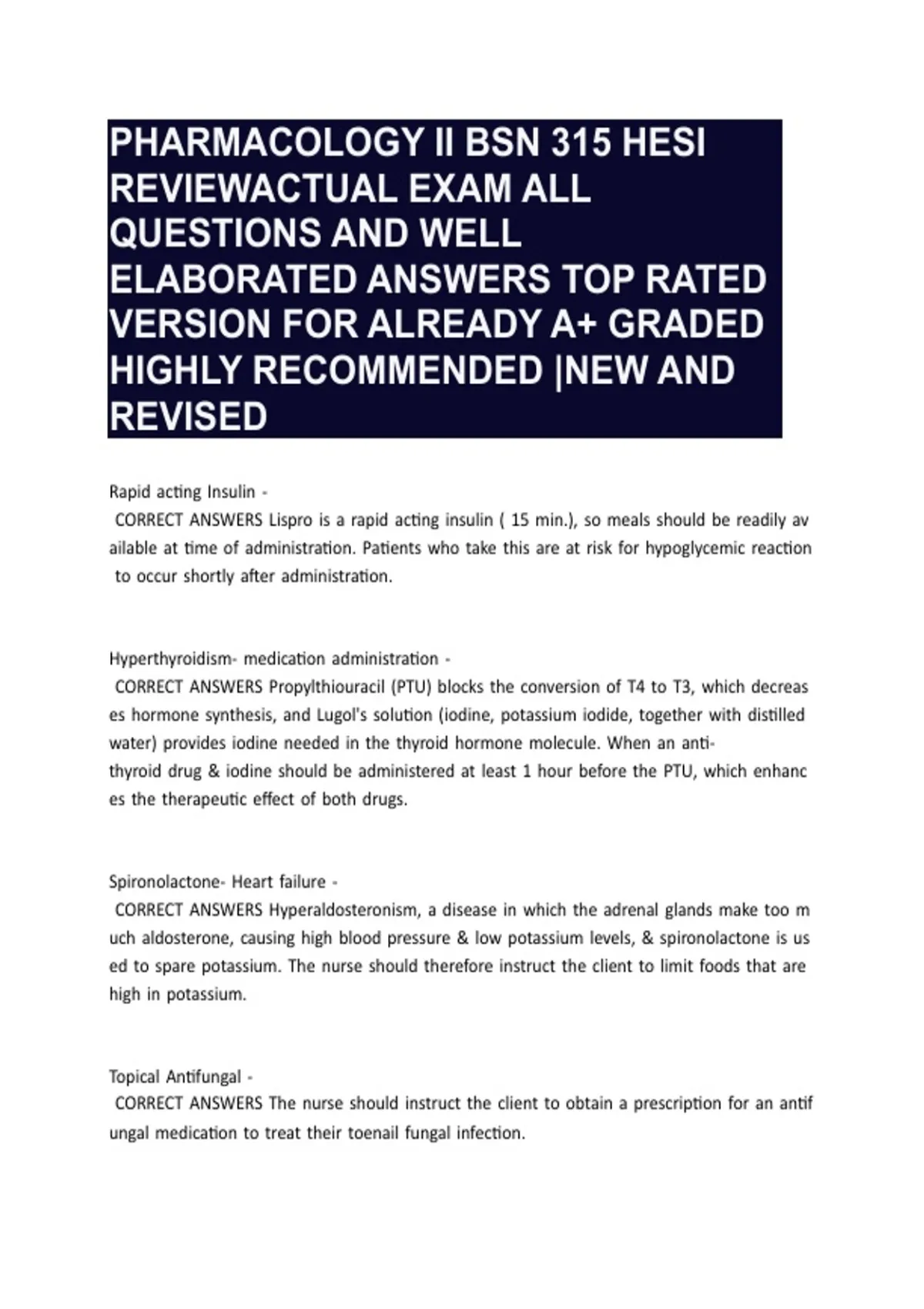 PHARMACOLOGY II BSN 315 HESI REVIEWACTUAL EXAM ALL QUESTIONS AND WELL ELABORATED ANSWERS TOP RATED VERSION FOR ALREADY A+ GRADED HIGHLY RECOMMENDED |NEW AND REVISED