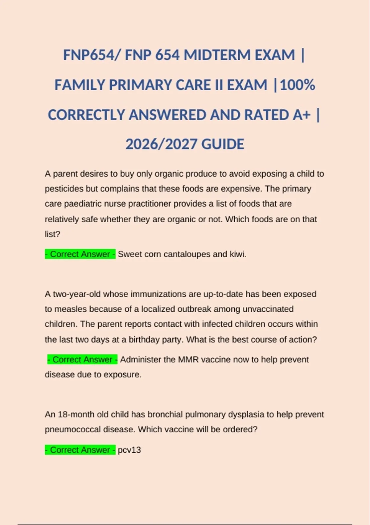 FNP654/ FNP 654 MIDTERM EXAM | FAMILY PRIMARY CARE II EXAM |100% CORRECTLY ANSWERED AND RATED A+ | 2026/2027 GUIDE FNP654/ FNP 654 MIDTERM EXAM | FAMILY PRIMARY CARE II EXAM |100% CORRECTLY ANSWERED AND RATED A+ | 2026/2027 GUIDE FNP654/ FNP 654 MIDTERM EXAM | FAMILY PRIMARY CARE II EXAM |100% CORRECTLY ANSWERED AND RATED A+ | 2026/2027 GUIDE