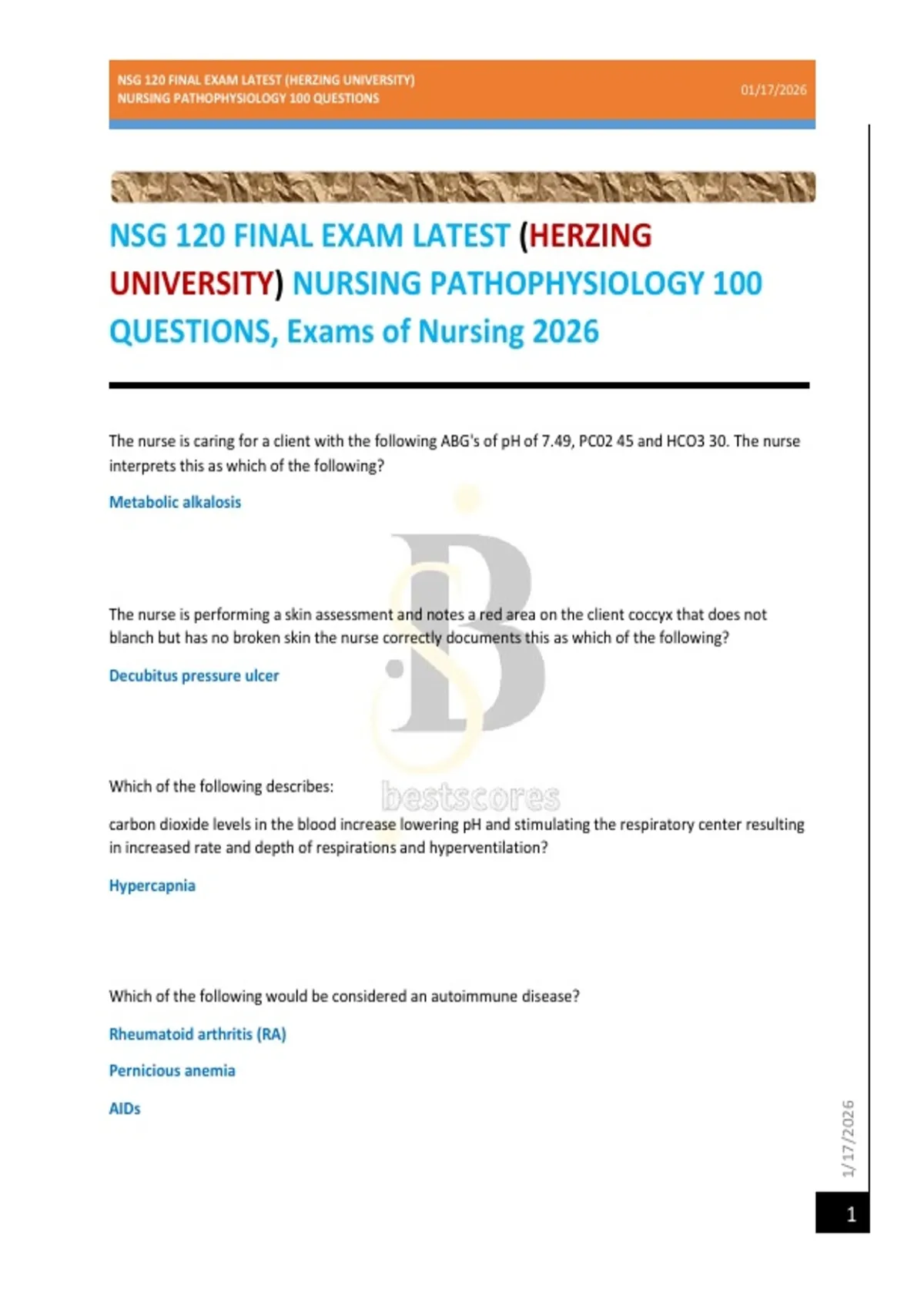 , NSG 120 FINAL EXAM LATEST (HERZING UNIVERSITY)