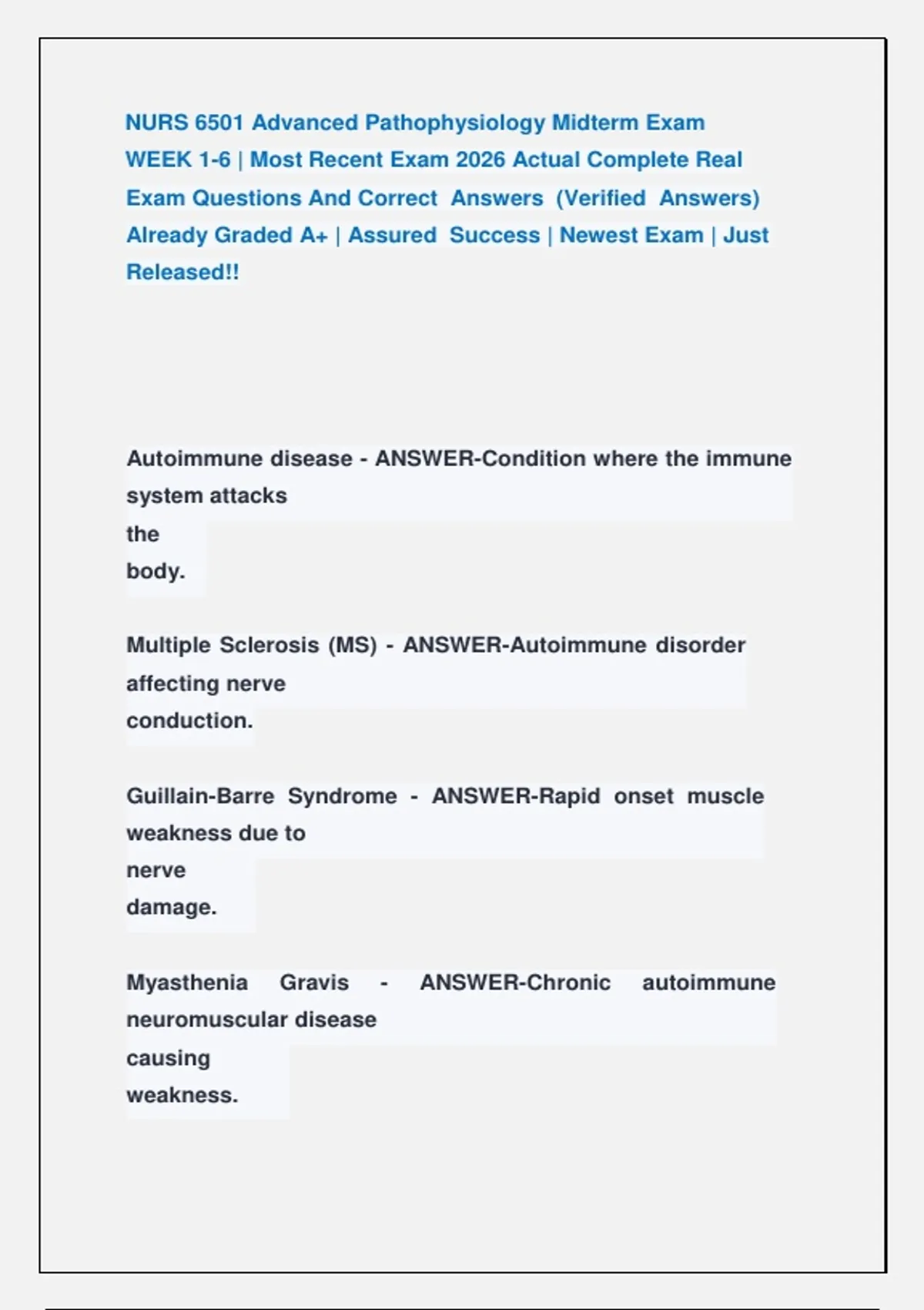 Myasthenia Gravis - ANSWER-Chronic autoimmune