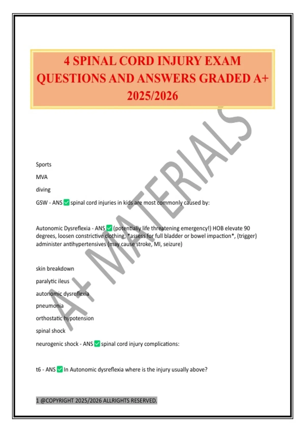 4 SPINAL CORD INJURY EXAM QUESTIONS AND ANSWERS GRADED A+ 2025/2026
